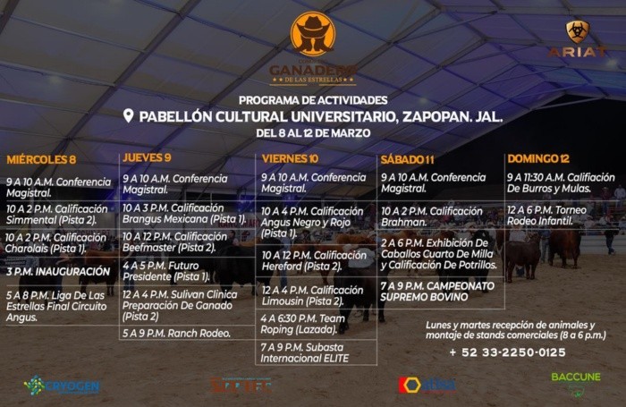 Con el objetivo de fomentar el desarrollo de la ganadería, mejorar la genética y la actualización en temas relacionados con la ganadería, este miércoles 08 de marzo arranca el Congreso Ganadero de las Estrellas en las instalaciones del Pabellón Universitario dentro de Centro Cultural Universitario en Zapopan.Alejandro Fernández Torres, director del Congreso Ganadero de las Estrellas 2023, explicó que se espera la asistencia de ocho mil a 10 mil personas en los cinco días que dure el evento.“Es nuestra segunda edición, la edición pasada fue en el Cortijo Los Fernández en Tonalá, pero este año por capacidad nos tuvimos que venir a las instalaciones de la Universidad que también se han sumado al proyecto”, agregó Alejandro Fernández.La segunda edición del Congreso Ganadero contará con la participación de un amplio grupo de ganaderías de Jalisco y de varios Estados de la República así como de diversos países líderes en ganadería como Suiza, Escocia, Estados Unidos, Canadá y Francia.Dentro de los objetivos del Congreso Ganadero se encuentran, promover el desarrollo y mejoramiento de la ganadería mexicana, exhibir y comercializar genética elite del ganado, ofrecer capacitación y actualizaciones sobre temas útiles e importantes dentro de la industria, además de la exhibición de diversas razas de ganado de la mejor genética a nivel nacional.Habrá áreas comerciales, conferencias, clínicas, talleres, eventos culturales, artísticos y de entretenimiento para toda la familia, contará también con área de alimentos y bebidas y con una granja interactiva para niñas y niños donde conocerán los procesos del campo mediante talleres interactivos de educación y entretenimiento, podrán elaborar productos desde un queso hasta un forraje y conocerán la importancia de la función de las abejas entre otros.“Tenemos una subasta internacional donde se van a subastar lotes que están en Argentina, Colombia, Estados Unidos y Brasil”, añadió Alejandro Fernández.Este congreso contará con 60 stands comerciales, 642 ejemplares en exhibición de diferentes Estados de la República entre ellos, Jalisco, Guanajuato, Colima, Nayarit, Nuevo León, Zacatecas, Chiapas y Tabasco, ocho razas de ganado elite en competencia (Angus, Beefmaster, Brangus, Brahman, Charolais, Hereford, Limousine, Simmental), así como caballos y potrillos en competencia, exhibición de lazada, lazo-doble, break away, rodeo infantil y campeonato supremo bovino, entre otros eventos.Se llevarán a cabo cuatro conferencias magistrales que serán gratuitas, donde se abordarán temas como Reproducción Bovina, Tecnologías en Reproducción Bovina, Nutrición Animal y Manejo Holístico de Praderas. Estas conferencias se llevarán a cabo los días 08, 09, 10 y 11 de marzo.La inauguración se efectuará el miércoles 08 de marzo a las 15:00 en las instalaciones del Pabellón Universitario en Centro Cultural Universitario, estará presidida por Ana Lucía Camacho Sevilla, Secretaría de Agricultura y Desarrollo Rural de Jalisco; Salvador Zamora Zamora, Presidente Municipal de Tlajomulco de Zúñiga; Eduardo Ron Ramos, Diputado Local; Ing. Homero García De La Llata, Presidente del Consejo Directivo de la Confederación Nacional de Organizaciones Ganaderas; Adalberto Velasco Antillón, Presidente de la Unión Ganadera Regional de Jalisco.El congreso tendrá un costo de 100 pesos por entrada. El programa de oficial actividades se puede consultar en: https://www.facebook.com/CongresoGanadero/.JM