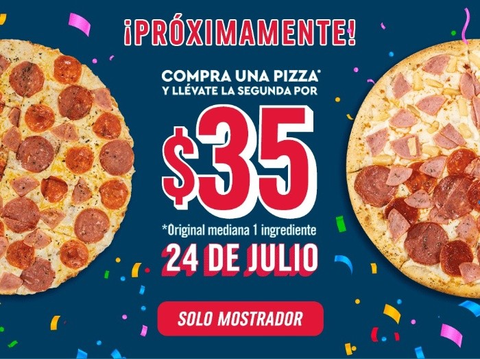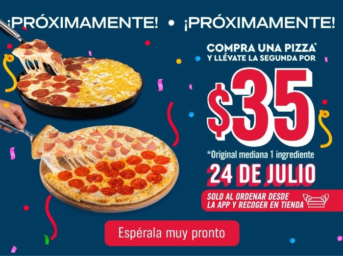 Uno de los placeres más grandes es poder disfrutar de una deliciosa pizza con extra queso. Por esa razón, los fanáticos de este platillo podrán disfrutar de una promoción que no pueden desaprovechar. Domino 's Pizza está celebrando su 35 aniversario en México, por lo que no quisieron pasar por desapercibido el momento y han puesto una promoción que incluye una pizza por el precio de 35 pesos. La promoción de 35 pesos comenzará desde la apertura de las sucursales, por lo que debes ir al sitio más cercano a tu domicilio.La promoción consiste en que en la compra de una pizza llévate la segunda por 35 pesos, esta debe ser original mediana 1 ingrediente.Esta promoción se aplicará al ordenar desde la App para recoger en tienda y en mostrador, además de que será válida únicamente el 24 de julio.Ahora que ya sabes esta promoción, te invitamos a degustar una deliciosa pizza de Domino's. SM