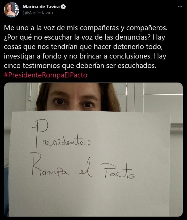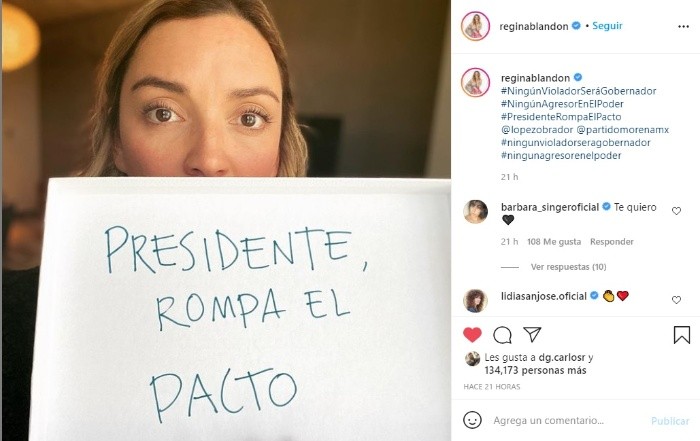 La postulación de Félix Salgado Macedonio a la gubernatura de Guerrero y la postura del Presidente Andrés Manuel López Obrador al respecto provocó que varias actrices publicaran imágenes en sus redes sociales con una frase: Presidente, rompa el pacto, refiriéndose al pacto patriarcal.Cuando le preguntaron al presidente sobre la candidatura del integrante de Morena mientras que existen denuncias de acoso sexual en su contra, contestó que hay que tenerle confianza al pueblo y que la gente es la que decide, por lo que pidió respetarla.Con "hashtags" como "#NingúnVioladorSeraGobernador" y "#NingúnAgresorEnElPoder", Regina Blandón colocó una imagen sosteniendo una hoja blanca con la frase "Presidente, rompa el pacto".La actriz Irene Azuela también se pronunció en sus redes sociales con el "hashtag" "#unpresuntovioladornopuedesergobernador". Azuela hizo algunas publicaciones en las que lamentó la actitud del presidente."Qué lamentable la respuesta del presidente López Obrador acerca del tema de Félix Salgado y las denuncias por abuso sexual. 'Hay que escuchar al pueblo', dice. Sí. Pero acuérdese que el pueblo también son las mujeres…". También consideró como una pena que el presidente "no sepa que la mayoría de los actos violentos sexuales hacia las mujeres suceden en espacios cerrados y son difíciles de comprobar....".La actriz María Aura también publicó en su cuenta de Instagram, "Señor presidente, #rompaelpacto, no avale el abuso a las mujeres desde el poder, ponga el ejemplo y cuídenos".Itzel Enciso, actriz y directora, publicó su fotografía sosteniendo el mismo cartel pero con otro mensaje acompañando la publicación."Yo soy mujer, mi voz también suena y no quiero gobernadores que estén acusados de abuso sexual. ¿Por qué querría a una persona que objetualiza a una mujer? ¿Por qué querría como gobernador quien en este sistema de poder abusa de una mujer? No, no es politiquería, es una convicción. Que para la agenda presidencial no sea importante, no significa que lo mire del mismo modo".Maya Zapata no se quedó atrás y escribió que la indiferencia del presidente era dolorosa."Con base en las declaraciones del presidente @lopezobrador en el espacio de La Mañarera nos pronunciamos en contra de su poca empatía, su nulo compromiso para atacar el complejo problema del abuso sexual en la infancia, adolescencia y adultez y que afecta en mayor medida a las mujeres".El director Benjamín Cann también se unió a las voces de actrices y subió su fotografía a redes sociales, con el "hashtag" "#PresidenteRompaElPacto".Marina de Tavira también compartió una imagen en redes sociales donde se unió a la voz de sus compañeras. “Por qué no escuchar la voz de las denuncias?”, escribió.“Hay cosas que nos tendrían que hacer detenerlo todo, investigar a fondo y no brincar a conclusiones. Hay cinco testimonios que deberían ser escuchados”, agregó.AC