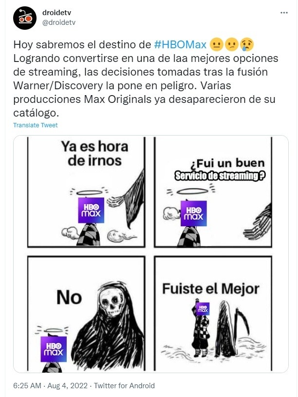 Luego de dos años funcionando como una de las plataformas de streaming más importantes, HBO MAX podría desaparecer en tan sólo unos meses. De acuerdo con algunas versiones, se trata de una decisión de David Zaslav, el presidente de Warner, para minimizar las pérdidas de la compañía ahora que se fusionaron WarnerMedia y Discovery Inc.La noticia no pasó inadvertida entre los seguidores de la plataforma, pues recientemente también se canceló la película "Batgirl", contenido original de la misma ,y salieron de la cartelera algunas otras producciones.No todas son malas noticias: se comenta que de ser cierto, HBO se convertirá en Discovery+. Los objetivos de la estrategia, además de controlar las pérdidas, es pagar deudas que la empresa tiene pendientes, también se buscará que las producciones lleguen a la pantalla grande y posteriormente sean llevadas a la plataforma. Por otra parte, Zaslav apostará por la realización de reality shows más que por proyectos con guión. El futuro de la empresa podría conocerse hoy por la noche, ya que celebrarán un evento interno donde se contabilizarán los datos del último cuatrimestre, además de posibles cifras de recorte de personal, pero mientras esto sucede, los usuarios ya reaccionaron en Twitter con memes.
