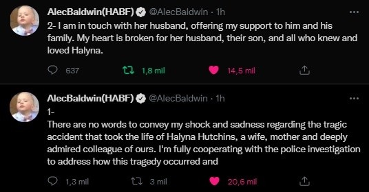 El actor y productor Alec Baldwin rompió el silencio sobre el accidente ocurrido durante la grabación de la película “Rust”, que cobró la vida de la directora de fotografía Halyna Hutchins.Fue a través de Twitter que Alec Baldwin informó que se siente conmocionado y triste por el “trágico accidente” en el set: “Halyna Hutchins, esposa, madre y colega nuestra profundamente admirada”, escribió Baldwin. “Estoy cooperando plenamente con la investigación policial para abordar cómo ocurrió esta tragedia”.Agregó que permanece en contacto con el esposo de Halyna Hutchins para brindarle su apoyo a él y a su familia. “Mi corazón está roto por su esposo, su hijo y todos los que conocieron y amaron a Halyna”.Durante el rodaje de "Rust", Baldwin mató accidentalmente a Halyna Hutchins, al disparar una pistola de atrezo que supuestamente era de fogueo y que no sabía que estaba cargada.Además, los disparos también han herido al director del filme, Joel Souza, que fue trasladado al hospital en Santa Fe (Nuevo México), en un incidente que está siendo investigado.Las autoridades están intentando determinar por qué la pistola de utilería estaba cargada y con qué tipo de proyectil, mientras era utilizada durante el rodaje de "Rust", un "western" que se filmaba en Santa Fe, en el estado de Nuevo México, EU.El incidente ocurrió en torno a primera hora de la tarde del jueves en el Rancho de Bonanza Creek, un escenario al que suelen desplazarse numerosas producciones de Hollywood.Por el momento, las autoridades descartan presentar cargos criminales y están entrevistando al equipo del filme con el fin de esclarecer los hechos.La compañía encargada del rodaje, en el que Baldwin ejerce como protagonista y productor, emitió un escrito que decía que el equipo completo se encuentra "devastado" por lo sucedido y se comprometía a ofrecer ayuda psicológica a todas las personas relacionadas con la filmación, que se suspenderá de manera indefinida.En los últimos años Baldwin ha participado en las películas de la saga "Mission Impossible: Rogue Nation" (2015) y "Mission Impossible: Fallout", así como en exitosos proyectos de televisión como "Saturday Night Live", con la que logró ganar otro premio Emmy, o la recientemente estrenada serie "Dr Death". AC
