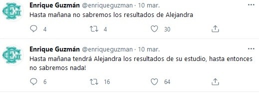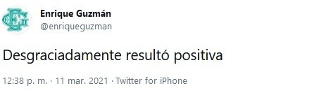 Un instante basta para que fallen las medidas sanitarias para evitar un contagio por COVID-19. Así le ha pasado a Alejandra Guzmán, quien ha dado positivo a SARS-CoV-2, según dio a conocer su papá, el también cantante Enrique Guzmán.En un breve mensaje en redes sociales, el intérprete de "Tu cabeza en mi hombro" dijo que su "desgraciadamente resultó positiva", sin hacer ninguna referencia a la también conocida como "Reina de Corazones", aunque en una publicación de ayer miércoles escribió que hasta el día siguiente se tendrían los resultados de su estudio.Ante ello es que el cantante de rock recibió la solidaridad de sus fans, quienes le enviaron tuits en el que desearon pronta recuperación a Alejandra, a la vez que dijeron que ella es "una mujer fuerte" y una "guerrera".Su publicación cuenta con apenas 55 me gusta y ha sido compartida 19 veces.Alejandra Guzmán ha estado muy activa en recientes semanas, pues además de haber participado en los Premios Lo Nuestro, estuvo en distintos programas de televisión, uno de ellos "Mimí contigo", conducido por la cantante Irma Angélica Hernández Ochoa, mejor conocida como Mimí.Ante esto cabe recordar que la integrante de Flans hace unos días también dio positivo a COVID-19, por lo que tuvo que ausentarse de su programa tras los resultados de su prueba, quedando la producción con la conducción de Carmen Muñoz.Ante el riesgo que representaba, es que Alejandra se sometió a la prueba, y sus resultados obtenidos la tarde de este jueves no han sido favorables.Por otro lado, cabe recordar que a mediados de febrero el cantante Enrique Guzmán recibió la primera dosis de la vacuna contra el Covid-19 desarrollada por AstraZeneca, por ser adulto de la tercera edad y vivir en la alcaldía Magdalena Contreras.El intérprete de "La Plaga" y "Tu cabeza en mi hombro" se presentó en la Clínica 22 del Instituto Mexicano del Seguro Social (IMSS) muy sonriente y tranquilo respondió el cuestionario previo a la aplicación de la vacuna, llegado el momento se descubrió el brazo izquierdo y recibió su primera dosis sin quejarse, al final hasta se dio un tiempo para sacarse fotografías con las enfermeras del módulo de vacunación.Tras la aplicación de la vacuna, el padre de Alejandra Guzmán, se dio tiempo para atender a sus seguidores y al personal del IMSS, quienes se le acercaron para pedirle la foto del recuerdo.JB
