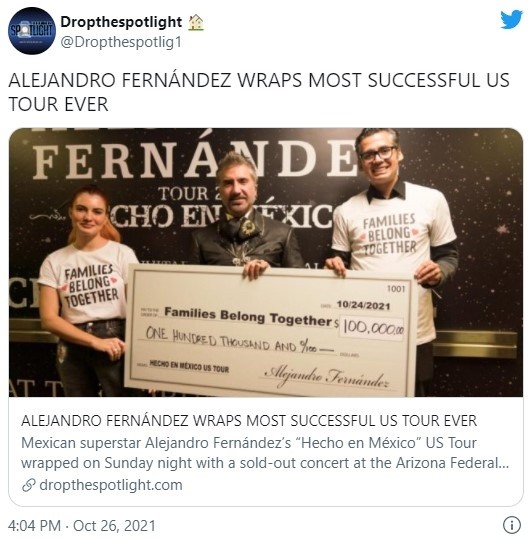 El cantante mexicano Alejandro Fernández donó 100 mil dólares en ganancias de su gira musical estadounidense a una campaña que lucha en contra de la separación de familias inmigrantes en Estados Unidos.El llamado "Potrillo" entregó un cheque por esa cifra a Families Belong Together durante un concierto en Los Ángeles el sábado, informó la campaña el martes."Estamos honrados de ser beneficiarios y colaborar junto a Alejandro Fernández," dijo Paola Luisi, directora de Families Belong Together, en un comunicado."Gracias a su apoyo, podemos continuar fortaleciendo nuestra lucha por dignidad, justicia, y compasión para las familias migrantes e inmigrantes y defender a nuestra comunidad de políticas de inmigración crueles".Families Belong Together es una campaña del grupo National Domestic Workers Alliance creada en respuesta a políticas de separación de familias migrantes en la frontera sur estadounidense durante el gobierno del expresidente Donald Trump. En la campaña participan casi 250 organizaciones diferentes que promueven políticas migratorias favorables a inmigrantes.Fernández anunció en abril su gira estadounidense y su colaboración con la campaña. La gira se titula "Hecho en México", igual que su último álbum, y finalizó el fin de semana tras pasar por ciudades como Las Vegas, Dallas, Houston, Chicago, Miami y Nueva York.Fernández ganó el año pasado el Latin Grammy al mejor álbum de música ranchera/mariachi por "Hecho en México". AF