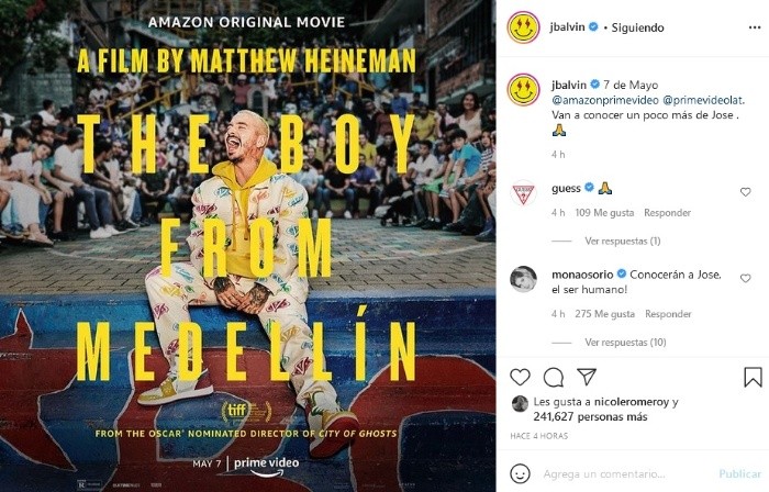La plataformas de Amazon Studios anunció que el 7 de mayo estrenará globalmente el documental "El niño de Medellín", proyecto que abordará la vida del cantante colombiano J Balvin.Este proyecto es dirigido y producido por Matthew Heineman, además de tener al mismo José Álvaro Osorio Balvin como productor ejecutivo junto a Fabio Acosta, Scooter Braun, Allison Kaye, Scott Manson, Jennifer McDaniels, Jenna Millman y Juan Diego Villegas, bajo la producción general de Juan Camilo Cruz, Myles Estey y Joedan Okun."Del realizador nominado al Oscar y ganador del Emmy, Matthew Heineman (Cartel Land, City of Ghosts, A Private War) llega un retrato asombrosamente íntimo de una de las más grandes superestrellas internacionales de la música de nuestros tiempos", explicó Amazon Prime Video en su comunicado sobre el tratamiento que tendrá "El niño de Medellín" para los fans de Balvin."El niño de Medellín sigue a J Balvin mientras se prepara para el concierto más importante de su carrera—un concierto agotado en un estadio en su ciudad natal de Medellín, Colombia-, pero al acercarse el evento, las calles explotan con inestabilidad política, obligando al músico -ganador del Latin Grammy- a lidiar con su responsabilidad como artista para su país y sus legiones de fanáticos alrededor del mundo".El documental dará una mirada sobre la presión pública del momento previo al concierto: "detrás de cámaras, Balvin también sigue lidiando con la ansiedad y depresión que lo han plagado por años. Filmado completamente durante la dramática semana antes del concierto, 'El niño de Medellín' nos da acceso sin precedentes al 'Príncipe del Reggaetón' y brinda una mirada inmersiva a uno de los momentos más cruciales y cargados de emoción de toda su vida".Hasta el momento se sabe que este documental tendrá una duración de 95 minutos y será clasificación para espectadores mayores de edad.jb