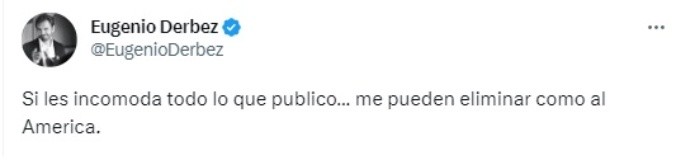 La noche del domingo 21 de mayo el conjunto de Chivas logró la hazaña y eliminó a las Águilas del América tras quedar en el marcador 3-2 en el global para así colocarse en la final de la Liga MX donde enfrentará al equipo de Tigres.Al terminar el juego la carilla en redes sociales no se hizo esperar y usuarios del Rebaño se burlaron de los aficionados americanistas tras la eliminación de su equipo.Incluso hubo aficionados de otros equipos que se burlaron del cuadro azulcrema, tal como sucedió con Eugenio Derbez aficionado al Cruz Azul y quien escribió un tuit en relación por la derrota y eliminación de los de Coapa. "Si les incomoda todo lo que publico… me pueden eliminar como al America", escribió Eugenio en su cuenta de Twitter. Varios seguidores del actor mexicano se unieron al comentario con risas y apoyando al protagonista de "No se aceptan devoluciones". "Siempre tan atinado", "Ese tweet me dió más risa de la que debería... y eso que no veo futbol", "JAJAJAJAJAJAAJAJAJAJA! Que grande", "Fuertes declaraciones maestro", fueron algunos de los comentarios. La final del futbol mexicano entre Chivas y Tigres ya tiene fecha, el partido de ida se jugará el jueves a las 20:00 horas en el Estadio Universitario mientras que la vuelta será el domingo a las 19:35 horas en el Estadio Akron. MF