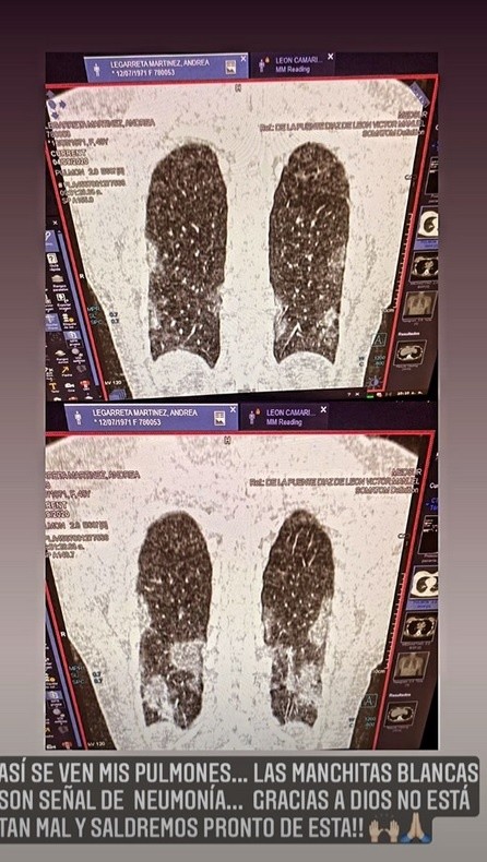 Con actitud positiva es como Andrea Legarreta enfrenta al coronavirus que padece y que la mantiene hospitalizada.Luego de dar a conocer que ella y su familia habían salido positivos a la prueba del COVID-19, la conductora dijo que ella es la que ha presentado síntomas más severos, pues le fue detectada una neumonía que la tiene en observación médica.A través de un video en sus redes, Legarreta aseguró que se encuentra bien, luchando para poder irse pronto a casa.Algunos de sus seguidores se asustaron cuando Andrea, en sus estados de Instagram, colgó unos videos en los que se observa cómo la trasladan en una cápsula especial para pacientes con coronavirus; sin embargo, explicó que esto lo compartió sólo para mostrar el buen trabajo que está realizando el equipo médico."Hay quienes se asustaron con mi video en la cápsula, no se asusten, estoy bien de verdad, sólo me están monitoreando".La conductora de Hoy felicitó al equipo médico que está luchando con todo para atender a la población contagiada, y calmó a los cibernautas que le han escrito alarmados por el contenido que compartió desde el hospital."Les mostré el video de la cápsula y la cápsula para que vean el manejo al trasladar pacientes en la zona COVID-19 de los hospitales. Mis respetos a la gente que labora en los hospitales, Dios me los bendiga".Andrea mostró una tomografía en la que se observa el estado de sus pulmones; se mostró con ánimo y segura de que pronto todo esto pasará."Así se ven mis pulmones… las manchitas blancas son señal de neumonía, gracias a Dios no está tan mal y saldremos pronto de esta".Aprovechó para extender un agradecimiento a todo el equipo médico que la ha atendido."Para que vean los cuidados y el manejo para trasladar pacientes COVID en los hospitales, gracias a todos los que me han atendido, mis respetos y agradecimientos. Así el recorrido por los pasillos para proteger a los demás, admirable labor de nuestro personal de hospitales, mis respetos y admiración, Dios los bendiga".JM