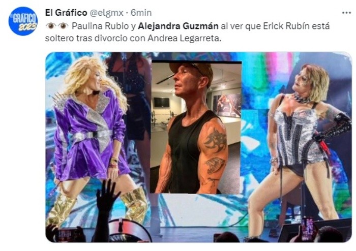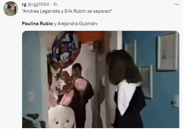 Hace unos momentos, Andrea Legarreta y Erik Rubín anunciaron el final de su relación tras estar más de 20 años juntos, siendo considerada una de las parejas más estables del mundo del espectáculo. Fue a través de Instagram donde los famosos dieron a conocer la noticia con un video y un largo mensaje contando las razones por las que decidieron terminaron. Tras dar a conocer la ruptura, los usuarios en redes sociales no perdieron ni un solo momento y compartieron varios memes en las diferentes redes sociales. Muchos de esos memes incluyen a las cantantes Alejandra Guzmán y Paulina Rubio, esto luego de que en los años de los 90 hubo un triángulo amoroso entre las cantantes y Erik Rubín, provocando morbo en la farándula y rompiendo una relación de amistad entre las cantantes. MF