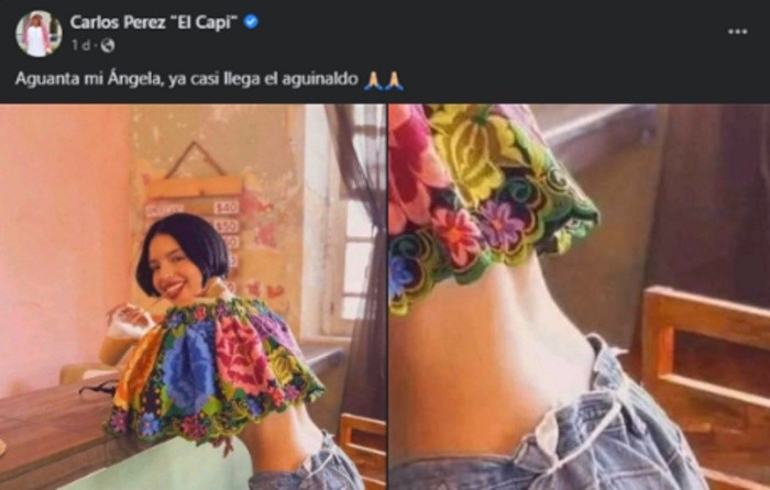 El comediante y conductor "Capi Pérez" se ha vuelto tema de conversación en redes sociales durante las últimas horas, luego de que en el programa matutino "Venga la alegría" de TV Azteca, realizara un comentario sarcástico a Ángela Aguilar sobre una foto que publicó hace unos días en su cuenta de Instagram.La intérprete de "La Llorona" posteo una serie de fotos en su cuenta de Instagram luciendo un outfit muy original, pero lo que llamó la atención fue que utilizó un lazo para detener sus pantalones, por lo que "El Capi" tomó esa oportunidad para bromear en redes sociales. Ángela Aguilar se encontraba en Mérida y se tomó el tiempo para compartir con sus seguidores esas fotos, en las cuales se puede apreciar que estaba recargada en una barra mientras tomaba una bebida refrescante. Su outfit consistió en una blusa corta con bordados de flores en diversos colores, que le hicieron lucir su cintura, además de unos pantalones holgados que estaban detenidos con un lazo blanco, como si a la también modelo le quedaran flojos.El detalle no pasó desapercibido por el humorista quien posteó en Facebook: "Aguanta mi Ángela, ya casi llega el aguinaldo", lo que provocó 70 mil reacciones y 2. 1 mil comentarios, hasta el momento.A pesar de que el comediante hizo eco de la fotografía, algunos seguidores de la hija de Pepe Aguilar también reaccionaron de una forma parecida."Ángela por fin está usando de los cintos que uso yo, ya me siento aesthetic", "Su cinturón Balenciaga", "Un buen sinto humilde", fueron algunas de las respuestas.Otros también compararon el pantalón con el estilo que usaba el actor Roberto Gómez Bolaños en el exitoso programa de televisión "El Chavo del 8"."Mientras ella le pone listón para achicar sus jeans, yo tengo que ponerle elástico para agrandarlos " escribió un tercer usuario.El internauta Uchiha Kira Kaneky le dio la idea a la cantante de vender uno de sus tenis para comprar un cinturón.Pese a los comentarios, es bien sabido que la joven suele utilizar marcas costosas, tanto para sus atuendos en eventos relevantes como premiaciones así como para sus shows.La artista no ha dado ninguna respuesta.MF