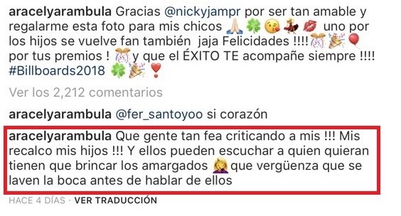La actriz Aracely Arámbula respondió en Instagram a las personas que criticaron a sus hijos y los llamó "amargados".Arámbula acudió a la más reciente entrega de los Billboard latinos, realizada el pasado 26 de abril de 2018 en Miami.Durante la ceremonia pudo convivir con el cantante Nicky Jam y compartió una fotografía junto a él."Gracias @nickyjampr por ser tan amable y regalarme esta foto para mis chicos. Uno por los hijos se vuelve fan también. Felicidades por tus premios y que el ÉXITO TE acompañe siempre", escribió para acompañar la imagen.Entre los más de dos mil comentarios para la publicación, había mensajes criticando el hecho de que sus hijos Daniel y Miguel, fruto de su relación con Luis Miguel, escuchen reggaetón.Arámbula no se quedó callada y en otro mensaje escribió:"Qué gente tan fea criticando a mis, recalco, a mis hijos. Y ellos pueden escuchar a quien quieran. Tienen que brincar los amargados. Qué vergüenza. Que se laven la boca antes de hablar de ellos".No es la primera ocasión que Aracely responde a una crítica.En julio de 2017 compartió una sexy imagen donde lucía su trasero en una piscina y ante los comentarios negativos, "La Chule" escribió que eran principalmente mujeres las que se quejaban y que nadie las obligaba a ver sus imágenes.JB