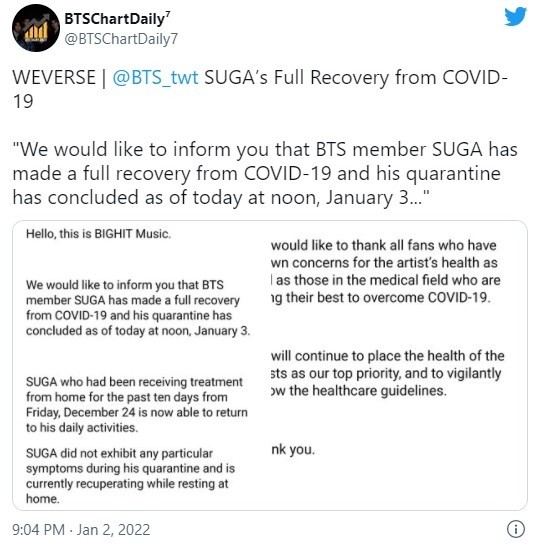 La banda surcoreana de K-pop BTS, comienza el año con el pie derecho, ya que Suga, integrante de la rap line del grupo se ha recuperado por completo tras contraer COVID-19 y ya no se encuentra aislado, comunicó hoy su discografía."Suga se ha recuperado completamente de la COVID-19 y su cuarentena terminó hoy al mediodía", indicó Big Hit Music en un comunicado publicado en la red social Weverse.El artista, de 28 años y cuyo verdadero nombre es Min Yoon-gi, dio positivo el pasado 24 de diciembre tras retornar el día anterior de Los Ángeles (EE.UU.), donde el grupo ofreció cuatro conciertos a final de noviembre, sus primeras actuaciones con público en dos años."Suga no mostró ningún síntoma en particular durante su cuarentena", añade el comunicado de Big Hit.Se espera que Big Hit anuncie pronto la recuperación de otros dos miembros de BTS, RM y Jin, que dieron positivo por COVID-19 un día después que Suga.Los tres contaban con la pauta completa de vacunación, según la discográfica. AF