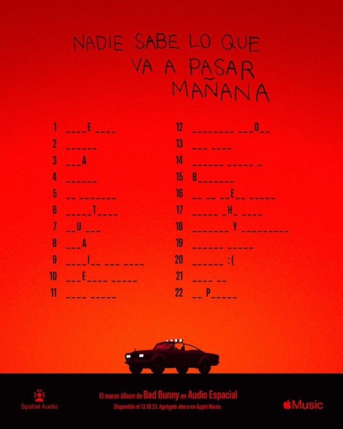 A pesar de que Bad Bunny había indicado a sus fans que se tomaría un descanso fuera de los estudios de grabación- luego del arrollador éxito de "Un verano sin ti"- el cantante se encuentra listo para estrenar un material discográfico con su sello personal.La mañana de este miércoles, Apple Music dio a conocer una dinámica especial para los seguidores de Benito Antonio Martínez Ocasio, con la cual podrán descubrir el tracklist completo del nuevo álbum "Nadie sabe lo que va a pasar mañana"."El día más esperado por muchos ya llegó", escribió Bad Bunny en una publicación de Instagram con la que dio el anuncio formal del lanzamiento. Como era de esperarse, desató expectativas entre los millones de personas que lo siguen.En la cuenta oficial de Apple Music se reveló la imagen de la que podría ser la carátula del nuevo álbum del "Conejo malo"."Ya que todo el mundo está tratando de adivinar, aquí están las pistas para adivinar el tracklist oficial", se indica al pie de la foto. El acertijo consiste en adivinar cada una de las letras que conformarán los 22 temas.Pero para hacerlo más fácil se incluyen algunas pistas. Por ejemplo, la imagen muestra letras intercaladas y espacios vacíos que deberán ser completados por los fans.Vale la pena mencionar que algunas de las canciones del nuevo álbum de Bad Bunny ya fueron lanzadas hace unas semanas, como lo es el caso de "Where She Goes" y "UN PREVIEW".vll
