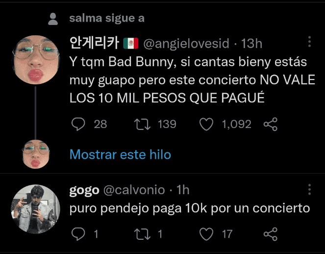 Aunque para algunas celebridades de la política como Mariana Rodríguez y su esposo, el gobernador de Nuevo León, Samuel García, fue toda una noche mágica asistir al concierto de Bad Bunny en Monterrey, hubo quienes no estuvieron de acuerdo.Una joven asistente dijo que el reciente concierto del exponente nombrado Artista del Año por Apple Music, no valió lo que pagó por su entrada. "Y te quiero mucho Bad Bunny, sí cantas bien y estás muy guapo, pero este concierto NO VALE LOS 10 MIL PESOS QUE PAGUÉ", escribió @angielovesid en Twitter.A los asistentes a sus próximos conciertos incluso les advirtió, "no vayan con las expectativas tan altas, porque la verdad, nada novedoso, no se veía casi nada [...] Benito viene a tu lugar (yo estaba al frente) como tres segundos y se va y vuelves a no ver nada".Y concluyó: "Genuinamente me gusta mucho BB, pero este show es una estafa, le duela a quien le duela [...] NADA de lo que estuvo en el show hacen un boleto de 10 mil pesos, estaba para pagar cuatro mil pesos".FS