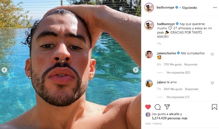 El rey del reggaetón, Bad Bunny, este miércoles 10 de marzo está celebrando 27 años de edad. Desde la tarde se ha vuelto tendencia en redes sociales porque subió a su cuenta de Instagram unas fotografías donde está disfrutando de un chapuzón, en lo que parece ser una alberca.Las imágenes superan los cinco millones de "likes" en dicha red social, en el mismo post publicó el mensaje: “Hay que quererse mucho. 27 añitos y estoy en mi peak. GRACIAS POR TANTO AMOR!!!”.Otros compañeros de la música como Nio Garcíay Olga Tañón le dejaron mensajes de felicitaciones.Bad Bunny es uno de los exponentes más importantes del género urbano, Benito Antonio Martínez Ocasio, su nombre real, en los últimos años ha sido uno de los músicos que más ha crecido a nivel global. El año pasado fue el artista más escuchado en Spotify, además con pocos meses de diferencia ha sacado tres álbumes “YHLQMDLG”, “Las que no iban a salir” y “El último tour del mundo”.Recientemente apareció en el programa “Saturday Night Live” para interpretar sus hits, entre ellos el más reciente “La noche de anoche” en colaboración con Rosalía, donde ambos mostraron una gran química en su performance.jb