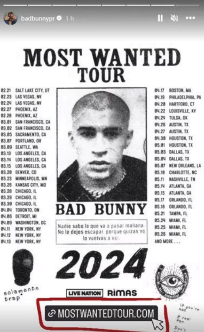 Las expectativas de los seguidores sobre el regreso del cantante puertorriqueño Bad Bunny a los escenarios fue finalmente confirmada, ya que el aclamado artista recién anunció su gira "Most Wanted" para el año 2024.El intérprete de "Ojitos lindos" presentó su álbum "Nadie sabe lo que va a pasar mañana" el pasado viernes 13 de octubre, un lanzamiento que rápidamente se posicionó en los primeros lugares de las listas de reproducción en plataformas de streaming como Spotify y Apple Music. Este proyecto fue bien recibido por el público, dado que Bunny regresó a sus raíces musicales.Para dar a conocer esta emocionante noticia a sus fieles fanáticos, el artista mantuvo la temática de vaqueros que ha caracterizado su lanzamiento.Compartió un video en su perfil de Instagram en el que lo vemos montando a caballo, vistiendo un pasamontañas, emulando a un vaquero del oeste. De pronto, observa una serie de carteles con la leyenda "Se busca" junto a su nombre colgados en una pared.Decidido, Bad Bunny desmonta, se quita el pasamontañas, toma uno de los carteles, lo examina detenidamente, lo arruga y finalmente lo arroja.En el cartel también se puede apreciar la enigmática frase: "No lo dejes escapar porque quizá no lo vuelvas a ver". Lo que ha generado especulación sobre si el artista planea tomarse un descanso después de su gira.Manteniendo un toque de misterio, el conejo malo añadió en su post el mensaje "pa' que vayan los que son", que posiblemente haga referencia a sus fans más apasionados y leales.Benito Antonio Martínez Ocasio, el nombre real del intérprete de "Un verano sin ti", ha compartido un total de 47 fechas para su gira en los Estados Unidos. Bunny dará inicio a la serie de conciertos el 21 de febrero de 2024 en Salt Lake City, Utah, y concluirá el 26 de mayo en Miami. Por supuesto, el recorrido de la estrella lo llevará por destacadas ciudades como Las Vegas, Houston, Chicago, Nueva York y Los Ángeles.Hasta el momento, no ha emitido un comunicado oficial acerca de si tiene planes de visitar Europa o Latinoamérica. No obstante, en el cartel de las ciudades programadas para el tramo final de la gira se incluye la enigmática palabra "Y más", lo que ha generado esperanzas sobre la posibilidad de que se agreguen más destinos a su recorrido.vll