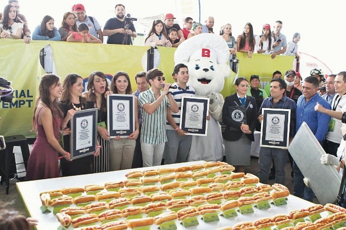 Fueron cuatro marcas mexicanas las que unieron esfuerzos para hacer la línea más larga de hot-dogs, batiendo el récord anterior al llegar a 1464.06 metros, como lo comentó Raquel Assis, de Récord Guinness.La medición se extendió hasta las cinco de la tarde, hora en que la representante de los récords certificó la longitud exacta, además de haber comprobado previamente que todos los lineamientos se cumplieron. No es fácil romper un récord con estas magnitudes, pues es necesaria una logística precisa para alinear los panes en las dos grandes secciones de mesas conjuntas: sobre dichos panes un ejército de cocineros fue colocando las salchichas y los aditamentos.Durante el montaje de los panes y las salchichas (con el preparado de la mostaza y salsa catsup) los asistentes a la Calle 2 tuvieron muchas actividades recreativas para pasar el rato. El ágora del recinto albergó dos presentaciones musicales: primero el proyecto JotDog, comandado por la vocalista María Barracuda. Después vendría la nostalgia noventera con la llegada de Kabah al escenario. El quinteto vocal complació a sus seguidores con sus grandes éxitos.Otros tipos de esparcimiento eran para los más pequeños del hogar, en un área donde se combinaron juegos de puntería, una alberca de pelotas y otros juegos. Para niños de mayor tamaño se montó una cancha de futbol alternativo, con los participantes compitiendo dentro de una gran pelota. Los más arriesgados entraron al área de gotcha, vestidos con la protección para no manchar la ropa de la tinta en cada disparo.Roger González, quien condujo el evento, invitó a concursar a miembros del público para cantar a capella canciones de Kabah, luego de terminada la presentación del grupo. Tras la diversión las miradas se avocaron a la última medición, donde se definió la distancia exacta de la línea de hot-dogs.El momento era de júbilo cuando Raquel Assis entregó la certificación a los organizadores. Una botarga en forma de oso (emblemático personaje de una de las marcas) posó con el certificado, para luego dar paso a la repartición de los hot-dogs entre el público asistente, dando por terminada la jornada.