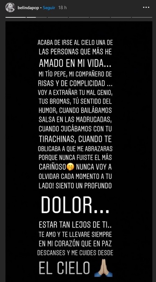 La cantante y actriz Belinda anunció la muerte de su tío Pepe, a quien despidió con profundo dolor a través de un mensaje y un video junto a él, "acaba de irse al cielo una de las personas que más he amado en mi vida", dijo la intérprete.En plena pandemia de COVID-19, Belinda se encuentra alejada de una parte de su familia que vive en España, entre ellos su tío Pepe; y anteriormente había manifestado que estaba preocupada por ellos debido a que el país ibérico fue uno de los más afectados por el virus.Sin dar detalles del deceso de su familiar, la intérprete de Dopamina recordó a su tío como su compañero de risas y complicidad: "voy a extrañar tu mal genio, tus bromas, tu sentido del humor, cuando bailábamos salsa en las madrugadas".Belinda no pudo viajar a España por las restricciones de vuelos, por lo que expresó: "Siento un profundo dolor estar lejos de ti, te amo y te llevaré siempre en mi corazón, que en paz descanses y me cuides desde el cielo".En el breve video que publicó en sus historias de Instagram, la cantante aparece junto a su tío cuando tuvo la oportunidad de visitarlo y convivir con él, "te abrazaré desde aquí con todo mi amor aunque no quieras", escribió Belinda, porque al parecer su tío no era el más cariñoso y ella siempre lo obligaba a que la abrazara.jb