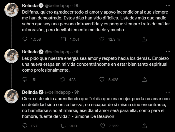 Belinda rompió el silencio y a fin habló sobre su rompimiento con Christian Nodal, con quien compartió momentos íntimos desde 2020 y que ahora no es nada más que una etapa del pasado.Fue a través de sus redes sociales que Belinda compartió con sus fans que “estos días han sido difíciles”, por lo que agradeció el apoyo y amor incondicional que le han demostrado a la cantante. “Ustedes más que nadie saben que soy una persona introvertida y es porque siempre trato de cuidar mi corazón, pero inevitablemente me duele y mucho”, escribió Belinda.La intérprete de “Luz sin gravedad” agregó que ahora está iniciando una nueva etapa en su vida mientras se concentra en estar bien “tanto espiritual como profesional”, dijo. “Les pido que nuestra energía sea amor y respeto hacia los demás”.Finalmente, Belinda compartió una frase de la filósofa francesa, Simone de Beauvoir:“El día que una mujer pueda no amar con su debilidad sino con su fuerza, no escapar de sí misma sino encontrarse, no humillarse sino afirmarse, ese día el amor será para ella, como para el hombre, fuente de vida”.Por su parte, Christian Nodal, eliminó casi todas sus fotos en Instagram, dejando de nueva cuenta al “Speedy González” como su única publicación, un comportamiento similar al de hace unos meses, cuando los fans rumoraban sobre el término de la relación de Beli y Nodal.Actualmente Nodal está celebrando su nuevo contrato con Sony Music, luego de la polémica por incumplimiento de contrato en su antigua relación con Universal Music.El pasado sábado por la noche, Christian Nodal confirmó que terminó su relación sentimental con Belinda, luego de rumores iniciados por el programa “Chisme No Like”; sin embargo, el cantante de regional mexicano subrayó que todo lo que se rumorea sobre el motivo del rompimiento con Belinda no son más que especulaciones.Luego de esta triste noticia, los fans de ambos cantantes apoyaron a cada uno de ellos en las redes sociales con hashtags “Te amamos Beli” y “Todos somos Nodal”.AC