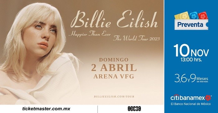 La reconocida cantante Billie Eilish ha confirmado su gira por México y Guadalajara está incluida entre las ciudades en las que ofrecerá su concierto. El anuncio viene unas horas después de que se informara que la ganadora de siete premios Grammy participará en el Tecate Pal’ Norte 2023. Billie Eilish confirmó su gira por México y estará el próximo 2 de abril en Guadalajara como parte del Happier Than Ever, The World Tour 2023.Después de meses de especulación, donde incluso en esta mañana habían surgido rumores luego de que Ticketmaster borrara una publicación donde anunciaba las fechas, por fin se hace oficial que la cantante estadounidense Billie Eilish vendrá a tierras tapatías. El concierto de Billie Eilish en Guadalajara será el cierre con broche de oro, pues primero se presentará en el Foro Sol de la Ciudad de México el 29 de marzo. Después, se presentará el 31 de marzo en el famoso festival musical Tecate Pal' Norte. El 2 de abril, Billie se despedirá de México con el calor y el cariño del público tapatío. El concierto de Billie Eilish en Guadalajara será el próximo 2 de abril en la Arena VFG a las 19:00 horas y tendrá una duración aproximada de 2 horas. Los boletos estarán disponibles a través de la plataforma oficial de Ticketmaster.Además, a través de un promocional se anunció que la preventa Citibanamex será el próximo jueves 10 de noviembre a las 13:00 horas. Mientras que la venta de boletos al público en general será habilitada el día 11 de noviembre a través de www.ticketmaster.com.mxEste mismo día se confirmó lo que tantos esperaban y es que la cantante estadounidense se presentará en el Foro Sol de la Ciudad de México el 29 de marzo. Asimismo, Billie Eilish formará parte de la cartelera que ofrece el Tecate Pal' Norte, festival que se realizará en Monterrey, Nuevo León del 31 de marzo al 2 de abril. En dicho evento, la cantante estadounidense figura como uno de los atractivos principales al lado de Blink 182 y The Killers. JL