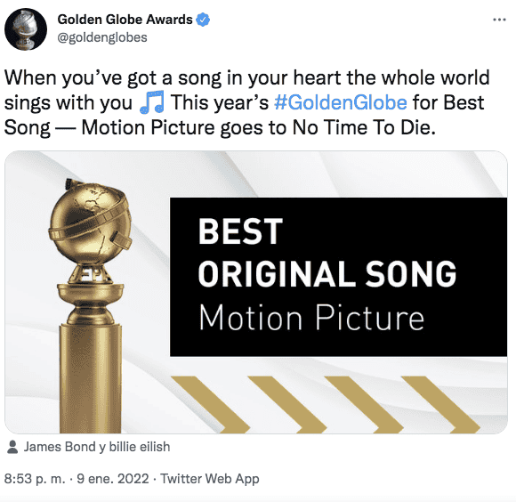 En medio de una edición marcada por la polémica de racismo, sexismo y corrupción que rodean a la Asociación de Prensa Internacional de Hollywood (HFPA, por sus siglas en inglés), la noche de ayer se anunciaron a los ganadores de los globos de oro de este año a través de una transmisión en redes sociales que no contó con la presencia del talento nominado, presentadores, y a diferencia de años anteriores, tampoco con una gran audiencia.Aunque este año se reconoció musicalmente al célebre y experimentado compositor Hans Zimmer con el globo de oro a mejor banda sonora por su trabajo en 'Dune', Fue otra estrella musical a quien se eligió para entregar el premio a mejor canción: Billie Eilish y su hermano Finneas por el tema ‘No Time To Die’, estrenado a principios del 2020 como parte de la última película de James Bond que lleva el mismo nombre, solo un par de semanas antes del inicio de la pandemia y de que se tuviera que aplazar durante varios meses el estreno de la cinta.La exitosa canción de Elish y Finneas que lleva el mismo nombre de última película de 007, competía con otros grandes músicos como Beyonce, con Be Alive; Lin-Manuel Miranda con uno de las canciones principales de Encanto; Carole King y Jennifer Hudson con y Aquí estoy para la cinta Respect y finalmente Van Morris con 'Down to Joy'.Aunque los nominados a los premios Óscar se darán a conocer hasta el 8 de febrero, todos los fans de Billie Eilish esperan más que una nominación para el poderoso tema musical que ya se había llevado el premio Grammy en 2021 a Mejor canción para una obra audiovisual. Sumado a ello, hay que recordar que seis de los últimos 10 ganadores del globo a la mejor canción terminaron con un premio de La Academia de Artes y Ciencias Cinematográficas en sus manos.