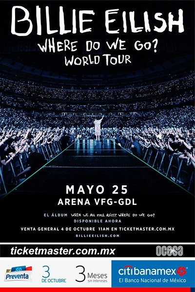Billie Eilish presentará su show en Guadalajara el 25 de mayo del próximo año en la Arena VFG, como parte de su gira Where do we go? World Tour, será el primero de dos conciertos programados para México.La artista también estará en Ciudad de México el día 27 de mayo en el Palacio de los Deportes, donde presentará parte de su material debut “When we fall a sleep, where do we go?”, que ha roto records y es actualmente el álbum más vendido en 2019 en Norteamérica.Where do we go? World Tour comenzará el 8 de marzo en Miami, la preventa para las fechas en México será el 3 de octubre. La venta general comienza el 4 de octubre a las 11:00 horas.Para ayudar a crear un ambiente de conciencia ecológica, Billie Eilish permitirá que los asistentes a sus conciertos lleven botellas de agua reutilizables, habrá estaciones dispensadoras de agua disponibles para los asistentes y no se permitirá el uso de popotes de plástico.El mes pasado Billie Eilish ganó su primer No. 1 en la lista Billboard Hot 100 con el tema ‘bad guy,’ de su álbum debut lanzado el 29 de marzo pasado.Recientemente Billie Eilish apareció en la portada de las revistas Rolling Stone, V y ELLE, y ha acumulado más de 17 mil millones de reproducciones en streaming globales hasta la fecha. NR
