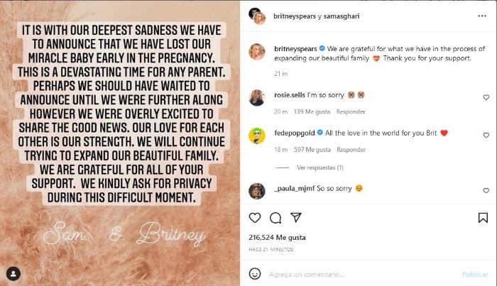 Este sábado, a través de sus redes sociales, la cantante Britney Spears anunció que perdió el bebé que esperaba con su pareja, el actor Sam Asghari. Este sería su tercer hijo.En una imagen publicada en su cuenta de Instagram, se puede leer el mensaje: "Es con nuestra más profunda tristeza que tenemos que anunciar que hemos perdido a nuestro maravilloso bebé al principio del embarazo”.“Este es un momento devastador para cualquier mamá o papá. Tal vez realmente deberíamos haber esperado para anunciar hasta que finalmente estuviéramos más avanzados. Por otro lado, estábamos extremadamente emocionados de compartir la buena noticia”.“Seguiremos esforzándonos por extender nuestro hermosa familia”, continuaron. “Estamos agradecidos por toda su ayuda. Pedimos amablemente privacidad durante este momento difícil”, concluye el post.Apenas el mes pasado, la cantante había usado sus redes sociales para compartir que, a los 40 años, estaba embarazada de nuevo, y aseguró que no saldría tanto de su casa para evitar que los paparazzis tomen fotos de su embarazo.JM
