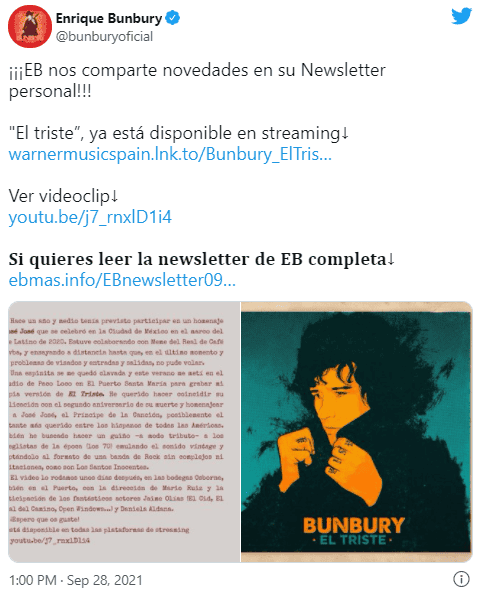 El cantante español Enrique Bunbury publicó este miércoles una versión de "El Triste", la canción que propulsó la carrera de José José, al que recordó dos años después de su fallecimiento.Bunbury quiso mostrar con esta adaptación todo su respeto hacia el artista mexicano, a quien definió en un comunicado como "posiblemente el cantante más querido entre los hispanos de todas las Américas".El compositor español detalló que hace un año y medio tenía previsto participar en un homenaje a José José que se celebró en la Ciudad de México en el marco del festival Vive Latino de 2020.Estuvo trabajando con Meme del Real de Café Tacvba y ensayando a distancia pero, por "problemas de visados y entradas y salidas", no pudo volar."Una espinita se me quedó clavada y este verano me metí en el estudio de Paco Loco en El Puerto de Santa María (Cádiz) para grabar mi propia versión de 'El Triste'", relató el español.Con sonidos del rock de la década de 1970 pero manteniendo el identificable estilo de balada de la canción con la que José José (1948-2019) impresionó al público en el Festival de la canción latina en 1970, Bunbury rindió su personal homenaje al príncipe de la canción."He buscado hacer un guiño -a modo tributo- a los arreglistas de la época (los 70) emulando el sonido vintage y adaptándolo al formato de una banda de rock sin complejos ni limitaciones", detalló el zaragozano.José Rómulo Sosa, conocido como José José, es reconocido como uno de los más grandes intérpretes románticos de México y Latinoamérica. Falleció en 2019 a los 71 años de edad en Florida, afectado por un cáncer de páncreas.Sigue leyendo…Si te interesó esta noticia y quieres saber más, entonces descarga y descubre INFORMAPlus, la aplicación digital de EL INFORMADOR, en donde tenemos contenidos exclusivos, seleccionados por nuestros editores, para darles una experiencia más completa a los lectores.Descarga la aplicación y pruébala GRATIS por treinta días.Si eres suscriptor de EL INFORMADOR tu acceso está incluido, solicítalo al 33 3678-7777AF