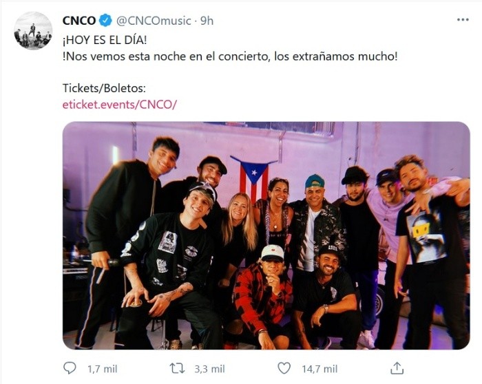 La boyband latina CNCO ofreció su concierto streaming “Déjà Vu Global” la noche de este viernes, con el que además de presentar su más reciente producción de estudio, en la que se versionan en estilo urbano canciones icónicas de los años 80 y 90 del pop en español, también significó un emotivo encuentro para Richard Camacho, Erick Brian Colón, Christopher Vélez y Zabdiel, quienes con emotividad compartieron por última vez el escenario junto a su ahora excompañero Joel Pimentel, quien hace un par de días anunció su salida de la agrupación.A través de la plataforma eTicket Live, CNCO conectó vía streaming con su público para hacer un recorrido por sus éxitos más reconocidos y presentar totalmente en vivo las canciones de “Déjà Vu”, producción estrenada en a finales de 2020 y con la que los jóvenes rindieron homenaje a estrellas del pop como Ricardo Montaner, Ricky Martín, Chayanne, Luis Fonsi, Sin Bandera, Cristian Castro, Chichi Peralta y Franco de Vita, entre otros.Aunque la agrupación –nacida en Miami en 2015 a raíz del reality show “La Banda”- ya había regresado a los escenarios retomando parte de su agenda en los recientes premios Lo Nuestro, esta ocasión fue una velada especial y diferente para el público, pues además de disfrutar de las canciones más icónicas de CNCO, también tuvieron oportunidad de charlar entre canción y canción con los cantantes y ver un poco detrás de cámaras aspectos de cómo se realiza la producción de un concierto streaming.El recorrido musical de CNCO para esta velada incluyó canciones como “Ya tú sabes” y “Beso”, así como de un set más acústico para dar paso a “Tóxica” y “Pretend”, por ejemplo, para después retomar su esencia retro y urbana con sus versiones de “Lo dejaría todo”, “Solo importas tú”, “Mis ojos lloran por ti”, “Entra en mi vida” y “Tan enamorados”.Como parte de la interacción que CNCO tuvo con sus fans, los cantantes respondieron algunas preguntas del público que les cuestionó curiosidades sobre sus canciones favoritas y con que otros artistas se irían de fiesta, por ejemplo.Para el cierre del concierto, CNCO complació a sus fans con las canciones más esperadas de la noche como “Reggaetón Lento”, “Honey Boo” y “Hey DJ”.Entre las sorpresas de la noche también destacó el reconocimiento que CNCO recibió en vivo, por parte de su disquera Sony, el Disco de Oro por “Tan Enamorados” en Estados Unidos, Doble Platino en Chile y Disco de Oro por “Déjà Vu” en Argentina y Chile.“Mi gente, como ya sabrán, este mi último concierto siendo parte de CNCO”, comenzó a explicar Joel Pimentel al agradecer a sus compañeros por la oportunidad de haber formado parte de un proyecto que irrumpió por completo en la industria musical y en especial en el urbano a nivel Latinoamérica y en Estados Unidos.“Quería tomar este tiempo para agradecerle a todo el mundo que haya hecho este sueño posible por los últimos cinco años, a los chicos, a los CNCOwners (fans del grupo), al equipo de managment, a Sony, a todo el mundo. Creamos una hermandad que nunca se va a quebrar”, expresó con voz entrecortada Joel Pimentel, quien al final del concierto fue abrazado, entre lágrimas y buenos deseos, por todo el equipo de producción.JM