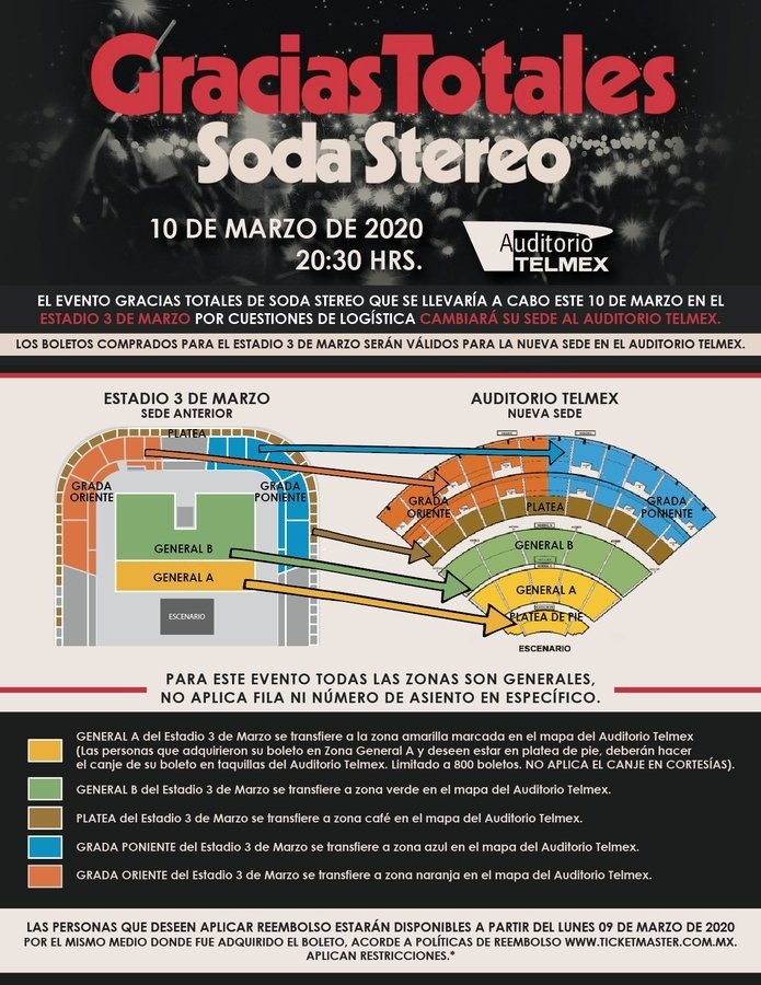 Ocesa informó el cambio de sede para el concierto de Soda Stereo el próximo 10 de marzo; ahora se llevará a cabo en el Auditorio Telmex. De acuerdo a un comunicado difundido por los organizadores, la decisión se da para que el público tapatío tenga una mayor comodidad en el evento musical programado para el próximo martes, cuya primera sede era El Estadio 3 de Marzo. Ahora el “show” que forma parte de la gira “Gracias Totales-Soda Stereo” tendrá como punto de encuentro las instalaciones del Auditorio Telmex, sin cambiar la fecha pactada. “Para garantizar que los asistentes tengan mayor comodidad y puedan disfrutar al máximo todas las emociones de este espectáculo multimedia”, subrayó Ocesa. En cuanto a los boletos, explicaron que no será necesario cambiarlos, los asistentes podrán presentarse en el auditorio donde serán ubicados en las secciones indicadas en el mapa general, según el boleto previamente adquirido. Asimismo, dijo que en caso de reembolsos se podrá aplicar a partir del 9 de marzo bajo las políticas de Ticketmaster. Finalmente proporcionó un número telefónico para solicitar mayor información. Es el siguiente: 33183800AC