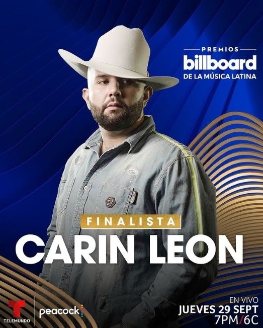 El músico de regional mexicano, Carín León, sigue posicionando su carrera, convirtiéndose en el artista mexicano más importante del momento en la industria musical. Esta vez sorprende a todos sus seguidores con la noticia de sus dos nominaciones en los Billboard latinos en las categorías “Artista Regional Mexicano del Año, Solista” y “Canción Regional Mexicana del Año” con “El Tóxico” junto a Grupo Firme.“Estoy muy feliz por estas dos nominaciones, muchas gracias a todo mi equipo de trabajo y a mi público por apoyarme desde el inicio en mi carrera musical”, mencionó el músico. La entrega de galardones se llevará a cabo el día 29 de septiembre en vivo en el Watsco Center en Miami y serán transmitidos por Telemundo, donde harán un reconocimiento a lo mejor de la música latina.La noche de premiación coincidirá con la Semana de la Música Latina de Billboard, que también volverá a realizarse en Miami, del 26 de septiembre al 1 de octubre, donde se realizarán conferencias, talleres, presentaciones, eventos y experiencias exclusivas para los fans. Demostrando el gran crecimiento a nivel nacional e internacional que ha tenido en su carrera, Carín León continúa trabajando en varios proyectos y colaboraciones que muy pronto todo su público podrá conocer. MF