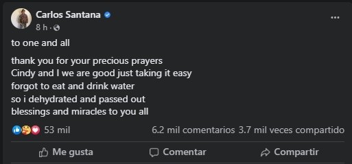 La noche de este martes el guitarrista Carlos Santana colapsó en pleno escenario mientras ofrecía un show en el Pine Knob Music Theatre en Clarkston, Michigan.Luego del incidente, personal médico subió al escenario a auxiliar al guitarrista de 74 años de edad, quien fue trasladado de emergencia a un hospital local para mantenerlo en observación. Pidieron a los fans orar por la salud del jalisciense.La razón por la que Santana —ganador de 10 Premios Grammy— se desmayó fue debido a que “se le olvidó de comer y beber agua”, así que se “deshidrató” provocando el desmayó, según detalló el representante del músico en redes sociales.Su mánager, Michael Vrionis, confirmó que Santana se encontraba "bien" luego del incidente, sin embargo, tendrá que posponer el próximo show agendado para el miércoles en Pensilvania.Tras el colapso de Santana en el concierto, rápidamente se viralizaron los videos del momento exacto del desmayó.Finalmente el músico agradeció a todos por sus oraciones. “Bendiciones y milagros para todos ustedes”, escribióEl músico nacido en México y su banda han estado de gira con el grupo Earth, Wind & Fire. Aún quedan 21 fechas, hasta finales de agosto, antes de que el astro detrás de éxitos como "Maria Maria", "Oye como va" y "Black Magic Woman", quien es miembro del Salón de la Fama del Rock & Roll, regrese a Las Vegas para su residencia en el House of Blues.En diciembre, Santana canceló una serie de presentaciones en Las Vegas tras someterse a un procedimiento cardíaco no especificado. El artista y los miembros de su banda también dieron positivo por COVID-19 en febrero, cancelando algunas fechas.AC