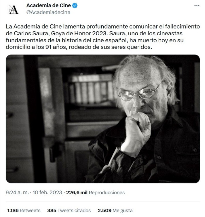 De acuerdo con lo que ha informado este día –10 de febrero de 2023–, la Academia de Cine española lamenta profundamente dar noticia del fallecimiento del realizador, guionista y creador escénico Carlos Saura (Huesca, España, 1932), quien estaba programado para recibir el Goya de Honor este año. Así, Saura, uno de los cineastas fundamentales para la historia del cine en su país, ha muerto hoy en su domicilio a los 91 años de edad, rodeado de sus seres queridos.Por otra parte, destaca la Academia, su última película, ‘Las paredes hablan’ (2023), se estrenó este pasado viernes 3, lo que es una muestra de la incansable actividad y del amor por el oficio que hasta el último momento mostró Saura. Mañana, en el Auditorio Andalucía de Sevilla, la 37 edición de los premios Goya hará homenaje a la memoria de un creador irrepetible.En este sentido, Carlos Saura fue cineasta, fotógrafo y escritor. Formado como director y guionista cinematográfico, su cine alterna la descripción realista con el surrealismo y posee puntualmente referencias simbólicas y alusiones alegóricas sociopolíticas. Al margen de la ficción, Saura también ha realizado diversos documentales de carácter musical.Algunas de sus obras más emblemáticas son ‘La caza’ (1965), premiada con el Oso de Oro en el Festival de Berlín; ‘Peppermint frappé’ (1967), galardonada con el Oso de Plata en el mismo certamen; ‘El jardín de las delicias’ (1970); ‘Ana y los lobos’ (1972); ‘Cría cuervos’ (1957); ‘La prima Angélica’ (1973), Premio Especial del Jurado en Cannes; y ‘Mamá cumple cien años’ (1979), nominada al Oscar como Mejor Película Extranjera, entre muchos otros títulos.Su colaboración con el bailarín Antonio Gades le llevó a dirigir la trilogía musical compuesta por ‘Bodas de Sangre’ (1981), ‘Carmen’ (1983) y ‘El amor brujo’ (1986), basadas en el drama de Federico García Lorca, la ópera de Georges Bizet y el ballet de Manuel de Falla, respectivamente. En noviembre de 1992 se le concedió la Medalla de Oro de la Academia de las Ciencias y las Artes Cinematográficas de España.Asimismo, ha recibido importantes condecoraciones internacionales como la Orden de Artes y Letras de Francia o la Orden al Mérito de la República Italiana. En marzo de 1994 fue investido Doctor Honoris Causa por la Universidad de Zaragoza. Carlos Saura es autor también de una importante obra como fotógrafo y ha escrito novelas que han sido traducidas a más de veinte lenguas, como ‘Esa Luz’ (1998), ‘Elisa, vida mía’ (2004) o ‘Pajarico solitario’ (1997).JM