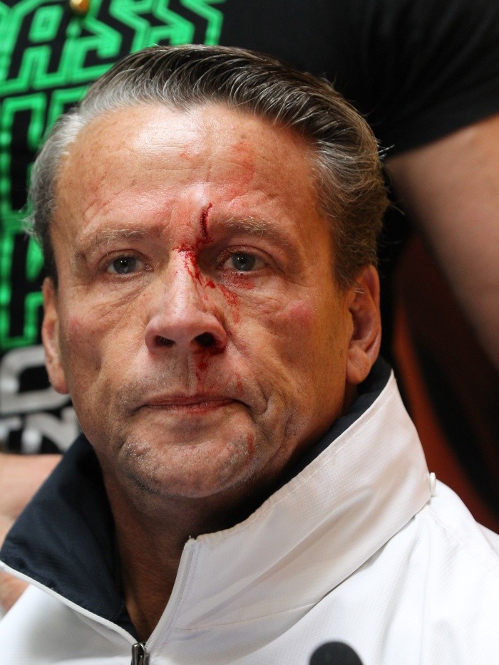Para arreglar la disputa Trejo vs. Adame que ya lleva más de 15 años en la televisión, entre que si Trejo es un oportunista y Adame fue quien hizo famoso a Trejo y a su libro "Cañitas", se hizo una conferencia de prensa con el fin de dar los últimos detalles de la pelea que saldará las cuentas entre los involucrados.La conferencia de prensa no podía comenzar porque desde que Carlos Trejo y Alfredo Adame cruzaron miradas comenzaron a atacarse física y verbalmente. Alfredo le dijo a Trejo "chingas a tu pu….ma… ca…", después de que ambos fueran separados por los elementos de seguridad.Al iniciar las preguntas, Alfredo estaba contestando sobre su experiencia en las artes marciales y sin esperarlo, Trejo le lanzó a Adame una botella de agua de la mesa que le provocó una cortada arriba del ojo izquierdo. Y los peleadores fueron separados rápidamente y la conferencia no pudo ser llevada a cabo con los dos en el mismo espacio.Después ambas partes continuaron la conferencia por separado.Alfredo aún sangrado bajó a continuar con la rueda de prensa y mencionó que Trejo era un cobarde y que no se podía esperar nada de él; que dejaría pasar el ataque aunque haya violado el contrato firmado por ambas partes. En él se mencionaba que no debía haber ningún enfrentamiento antes de la pelea."Ya vieron lo que pasó, de este mamaracho cobarde no se puede esperar otra cosa. Todo esto se suma a la cuenta, no es la gran cosa, toda mi vida he estado acostumbrado a eso, tengo cicatrices en todos lados", expresó.Lo recaudado en el enfrentamiento por parte de Alfredo Adame será donado a una asociación que ayuda a niñas abusadas sexualmente ubicada en la ciudad de Monterrey.Por lo que mencionó el conductor:"La única satisfacción que voy a tener es partirle su puta madre, él dijo que no va a donar nada porque es un muerto de hambre, eso lo que es", dijo.Alfredo Adame salió directo al hospital para curar la herida a la que consideró tal vez necesitaría algunas puntadas.Por su parte, el cazafantasmas bajo a dar la cara y justificó su ataque dando la verdadera razón de por qué odia a Adame y es porque un joven cercano a él habría muerto por culpa del conductor.Y añadió que lanzó la botella porque Adame un día le mando un audio donde decía que le iba a meter un balazo en la cabeza, así que no se podía quedar con los brazos cruzados. Dijo que sólo iba a esperar a la pelea para terminar de una vez por todas con todo lo que Adame le ha hecho y hacer justicia."Al ring van a subir dos y sólo uno va a bajar, vienen a ver show pues les voy a dar eso. Les aseguro eso. Esto no es un deporte, es un ajuste de cuentas. No hay reglas", aseguro Trejo.Y agregó "Den gracias a Dios que fue la botella, y no algo más. Él aventó la base del micrófono, así que no lo defiendan".La pelea consiste en tres rounds de "vale todo" con reglas de artes marciales mixtas, llevarán protectores bucal y de genitales. El foro del enfrentamiento contará con seguridad especial para la protección de los contrincantes el próximo 2 de agosto en el Foro 360.jb