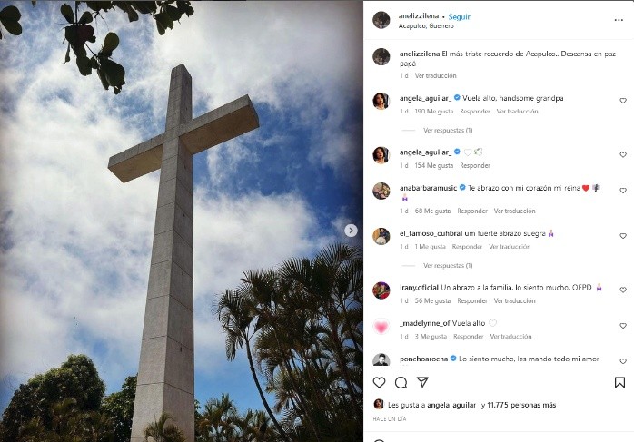 Este pasado 25 de marzo, mientras el mundo del espectáculo despedía al reconocido actor Xavier López "Chabelo", la familia de Ángela Aguilar se vistió de luto para despedir a Adrián Álvarez, abuelo materno de la cantante.La noticia la dio a conocer la esposa de Pepe Aguilar, Aneliz Álvarez, a través de sus redes sociales, donde publicó la foto de una enorme cruz, además de un par de imágenes en las que aparece con su padre: "El más triste recuerdo de Acapulco. Descansa en paz papá", escribió.Aunque no se ha dado ningún detalle sobre el deceso, se sabe que el señor Álvarez perdió la vida durante un viaje que realizó con su familia al puerto de Acapulco.Pero Aneliz no fue la única en despedirse con un emotivo mensaje, la intérprete de "Qué Agonía" también dedicó algunas palabras a su abuelo en el que le deseaba descanso eterno: "Vuela alto, handsome grandpa" expresó en un primer comentario.Posteriormente publicó un emoji de una paloma y un corazón blanco.Desde la tarde de este sábado, Ángela compartió con sus seguidores que no se encontraba en uno de sus mejores momentos, mediante una carita triste que publicó en su cuenta oficial de Twitter; sin embargo, muchos adjudicaron su tristeza a la partida del presentador de televisión, ignorando que ella estaba enfrentando su propio duelo.Pero también hubo quienes le externaron sus más sinceras condolencias y le desearon, a ella y a su familia, pronta resignación:"Lamento lo que estés pasando, Angelita, que los comentarios malos no te desanimen", "Lo siento mucho beba, te mando toda la fuerza", "Lo siento mucho, que tristeza más grande. Un gran abrazo para toda la familia", "Mi más sentido pésame, Ángela, y QEPD tu abuelo", "Estamos contigo y tu familia", son sólo algunos de los comentarios que pueden leerse.vll