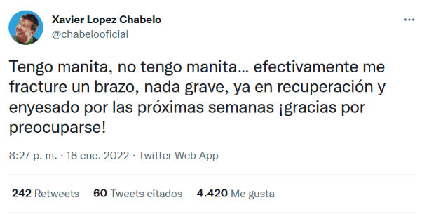 A través de su cuenta oficial de Twitter, Xavier López “Chabelo” compartió a sus seguidores que se encuentra en recuperación tras un accidente que le provocó una fractura en el brazo en recientes días.“Tengo manita, no tengo manita… efectivamente me fracturé un brazo, nada grave, ya en recuperación y enyesado por las próximas semanas ¡gracias por preocuparse!”, escribió "Chabelo" en sus redes sociales, aunque no ha brindado más detalles sobre cómo ni dónde sufrió el accidente que de momento lo mantendrá enyesado.Los seguidores del conductor, quien por 48 años llevó la titularidad de su programa televisivo “En familia con 'Chabelo'” a través de Televisa, le expresaron buenos deseos para que su recuperación sea rápida y sin mayores complicaciones.Entre los comentarios de los fans también destacan algunos con humor publicando memes sobre cómo "Chabelo" está viviendo su recuperación, además de sugerirle que tenga más cuidado ante este tipo de lesiones al recordarle que tiene 86 años de edad y cualquier incidente puede ser de alarma en su salud.Otros fans han aprovechado la reactivación de "Chabelo" en su cuenta para expresarle deseos de volverlo a ver en la pantalla con algún programa como el que lideró por décadas, por lo que animan al conductor a que busque negociar con alguna televisora nacional como Televisa o TV Azteca.De acuerdo a El Universal, personas cercanas al también actor, habrían confirmado que "Chabelo" se accidentó en diciembre del 2021, aunque tampoco se han dado más detalles sobre cómo sufrió el percance. Entre los trabajos más recientes de "Chabelo" que lo han mantenido en la mira del público destaca el filme mexicano “El complot Mongol” de 2019, dirigido por Sebastián del Amo y co-protagonizado por Bárbara Mori y Damián Alcázar.GC
