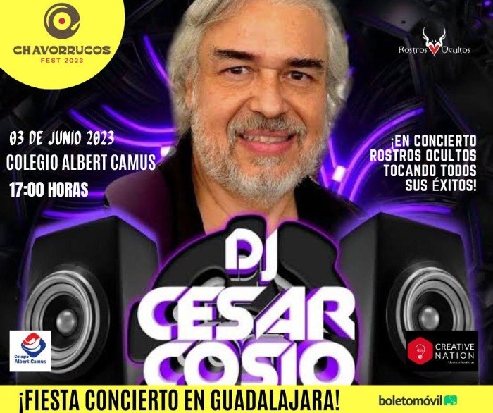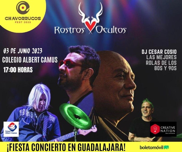 Para los amantes de la música, se llevará a cabo el 3 de junio en las instalaciones del Colegio Albert Camus, el concierto “Chavorrucos Fest 2023”, el cual es un evento que organiza la empresa Creative Nation. El evento se realizará con la intención de poder abrir un espacio donde todo el público amante del buen rock y de la música bailable de los 80s y 90s puedan conectar y divertirse en una fiesta donde el legendario grupo de rock Rostros Ocultos y el DJ César Cosío, estarán amenizando y haciendo bailar a los asistentes.Las puertas se abrirán a las 17:00 horas, comenzando en punto de las 18:00 y terminará a las 23:00 horas. El domicilio es camino Arenero 777. El Bajío. 45017 en Zapopan, Jalisco. La venta de boletos en línea es a través de boletomovil.com/evento/chavorrucos-fest.Rostros Ocultos es una banda de rock en español originaria de Guadalajara. Fue fundada en 1985 por el guitarrista Arturo Ybarra y el vocalista Agustín Villa Rojas “Cala”. La banda se caracteriza por su estilo de rock clásico y letras profundas y poéticas. A lo largo de su carrera, Rostros Ocultos ha lanzado varios álbumes de estudio, entre los que destacan "disparado" (1986), “Abre tu corazón" (1989), “Músicos poetas y locos" (1995) y “15 Celebración” (2000) un álbum de duetos que marcó el precedente y la tendencia en la música de hacer colaboraciones en esta producción tuvieron a bien celebrar sus 15 años de trayectoria con artistas de la talla de Alex lora, Alex Syntec, Benny Ibarra y Marciano Cantero de Enanitos Verdes. Rostros Ocultos estará presentando todo su repertorio de éxitos que durante 38 años han ido recopilando y colocándolos en el gusto de los amantes del Rock en español, en donde clásicos como “El final” y “Abre tu corazón” sonará fuertemente para el deleite de sus fans y todos los asistentes.El DJ César Cosío por su pasión, estilo y conocimientos en música, el DJ mexicano ha sido el favorito para amenizar grandes eventos a lo largo y ancho del mundo incluyendo personajes de la realeza y del deporte así como estrellas de Hollywood que han gozado de su experiencia de más de 41 años y ha puesto a bailar a los famosos en eventos privados de la talla de Giorgio Armani, Lisa Marie Presley, Quincy Jones John Travolta, Tom Cruise, Seal, Heidi Klum, Barbara Streisand, Ophra Winfrey, Eva Longoria, Colin Cowie, Dan Aykroyd, Manny Paquiao y Nonito Donaire.Ha formado parte como DJ de los conciertos de Sir Elton John, The Rolling Stones, Gloria Gaynor, Tavares, KC & The Sunshine Band, Nathalie Cole, The Trammps, Technotronic, Wisin & Yandel, Pitbull, Scorpions, Sammy Hagar, Credence Clearwater Revisited.Así como DJ de las estrellas de la música latina El TRI, Juanes, Maná, Luis Miguel, Alejandro y Vicente Fernández, Juan Luis Guerra, Noelia y Gloria Trevi por mencionar algunos. Y será el encargado de estar cerrando la noche con sus mezclas llenas de ritmo.MF