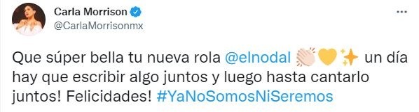 A pesar de estar en medio del huracán tras la ruptura con Belinda, el cantante Christian Nodal se mantiene respaldado no solo por el público que ha elogiado su más reciente lanzamiento "Ya no somos ni seremos", siendo este su nuevo sencillo tras confirmar su truene, pues parece que la comunidad musical también se ha interesado en esta nueva faceta de Nodal.La canción en cuestión, ya ha superado los 10 millones de reproducciones en YouTube, y a través de redes sociales los fans han compartido el tema de Nodal haciendo referencia a su rompimiento con Belinda, quien también a una semana de haberse difundido su separación, también sacó a promocionar "Mentiroso", que también ha sido relacionado a su fallida historia de amor.Pese a que los fans de cada cantante ha tomado partido, la industria musical podría verse beneficiada por las canciones que deriven de este rompimiento entre Belinda y Nodal, pues hasta colegas de los escenarios ya comienzan a hacer ofrecimientos para emprender duetos.Este es el caso de la cantautora Carla Morrison, quien vía Twitter etiquetó a Nodal en una publicación en donde le sugirió que más adelante puedan hacer una colaboración. Morrison destacó que la nueva canción de Christian "Ya no somos ni seremos" es bella."Que súper bella tu nueva rola @elnodal un día hay que escribir algo juntos y luego hasta cantarlo juntos! Felicidades! #YaNoSomosNiSeremos", escribió Carla Morrison ocasionando inmediatamente más comentarios de los fans que alentaron a que ambos cantantes puedan realizar un proyecto en el futuro.Christian Nodal, quien en sus redes ha agradecido el apoyo de su público y anunció que próximamente vendrá un dueto con la banda tapatía Maná, reaccionó a la publicación inicial de Morrison respondiendo que "Sería un placer" trabajar juntos.JL