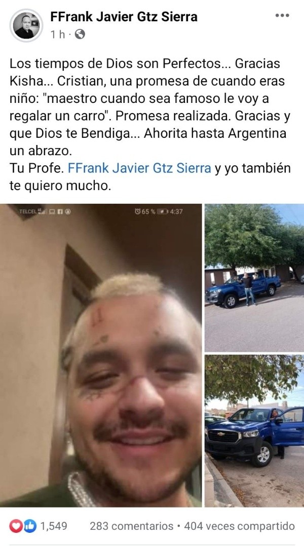 El cantante de regional mexicano Christian Nodal, le cumplió una promesa a su maestro de primaria y le regaló una camioneta nueva.A través de sus redes sociales, el maestro Francisco Javier Gutiérrez Sierra compartió cómo fue sorprendido por el intérprete de "Adiós Amor".Hasta su casa ubicada en la colonia Infonavit Benito Juárez de Caborca, Sonora, su famoso exalumno le envió un pick up último modelo de color azul.El maestro compartió el generoso gesto de Nodal y el aprecio que le tiene."Los tiempos de Dios son Perfectos... Gracias Kisha... Cristian, una promesa de cuando eras niño: "maestro cuando sea famoso le voy a regalar un carro". Promesa realizada. Gracias y que Dios te Bendiga... Ahorita hasta Argentina un abrazo. Tu Profe. FFrank Javier Gtz Sierra y yo también te quiero mucho".La publicación rápidamente se hizo viral y los comentarios de gusto para ambos no se hicieron esperar."Que padre noticias! Los frutos de tu dedicación, me imagino que lo que más atesoras es el tiempo que compartes con tus alumnos, celebro contigo!!!"."WOW... Que hermoso detalle y no por el valor... sino por lo que significa una promesa...muchas felicidades...!!! Para los dos..."."Honor... honor a quien honor merece... mil felicidades FFrank Javier Gtz Sierra, es solo una muestra del granito de arena o roca... que usted como excelente maestro, pero mejor como persona, logra inculcar a sus alumnos... que dios le siga dando esas ganas y la energía para seguir ayudando a nuestros niños que tanto lo necesitan. Y muy honorable y reconocible el acto de nuestro orgullo caborquense...".MF