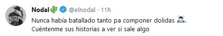 A sus 22 años Christian Nodal se encuentra muy enamorado de Belinda, lo que está causando estragos a la hora de componer debido que en este momento no puede pensar en temas como el desamor, así que pide ayuda en sus redes sociales.Al parecer el amor lo ha cegado completamente que tratar de imaginarse en situaciones de dolor, desamor y traición, es algo imposible, así que el cantante decidió pedir consejos a sus seguidores."Nunca había batallado tanto pa' componer dolidas… Cuéntenme sus historias a ver si sale algo", escribió en su cuenta de Twitter.La publicación del dueño del corazón de Belinda, quien pidió que le contaran sus historias de desamor, se volvió inmediatamente viral, que cientos de personas han desahogado sus penas amorosas. Hasta la tarde de este miércoles lleva más de dos mil tuits citados y más de 27 mil me gusta.Entre las historias de amor, también le dejan advertencias al cantante sobre su relación, como por qué no es bueno hacerse tatuajes de pareja, como el que ya se hizo con Belinda.Hace más de ocho meses, Nodal hizo pública su relación con Belinda después de haber convivido en el programa televisivo "La voz", fue "amor a primera vista", un romance que surgió muy rápido entre ambos cantantes, el cual muchos predijeron que no duraría mucho, pero a pesar de los pronósticos la pareja se ve cada vez más enamorada y sólida.jb