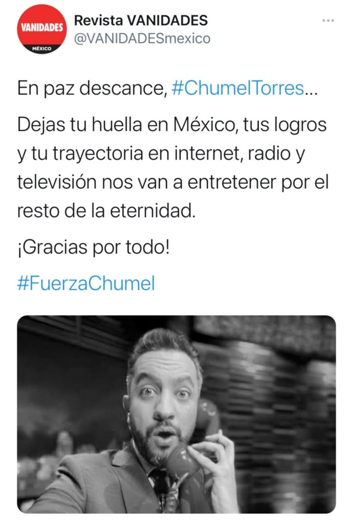 Luego de que una cuenta falsa de un medio impreso publicara la noticia de que Chumel Torres había muerto tras haber sido sido atropellado esta madrugada, el comediante y youtuber negó estos rumores y aseguró que se encuentra bien."Amigos hay unos reportes de que me habían atropellado y que tenía baja respiración por el COVID, no crean nada de esto. Estoy bien, estoy aquí en mi casa pasándola cool, ustedes de verdad no tengan ningún pedo, yo estoy a todo dar, ok, cuídense mucho, hasta luego", dijo Chumel mediante un video en el que mostró su trasero.La noticia de su muerte desató una oleada de memes y discusiones en las redes sociales entre los seguidores del comediante y de quienes lo desacreditan.JM