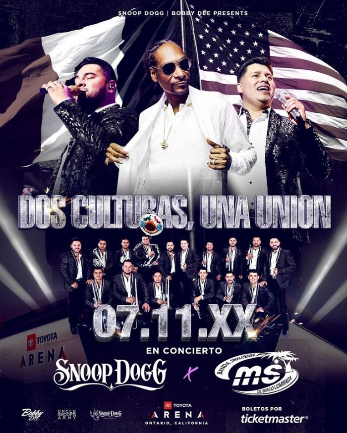 Ya lo habían anunciado y hoy se confirmó, y es que Snoop Dogg y Banda MS de Sergio Lizárraga compartirán escenario.Así es, al parecer al rapero de "Young, wild & free" o "Beautiful" no le importa el idioma o el sonido, ya que para él la música es el lenguaje universal y por ello armó una presentación el próximo 11 de julio en Ontario, California, para dejar claro esto a lado de la banda procedente de Mazatlán, Sinaloa.El evento "Dos culturas, una unión", que así nombró el nacido en Long Beach, California pondrá a consideración el rap y los sonidos de la banda que tocará en Coachella.El 12 de enero los integrantes de la MS se reunieron con Snoop Dogg para platicar sobre una colaboración musical que querían hacer entre ellos y que el estadounidense ya había dado a conocer este deseo en anteriores entrevistas, de esta unión que hubo videos y fotos en la página del rapero salió dicho evento.Recientemente la Banda MS tuvo varias presentaciones en el Staples Center de Los Ángeles y agotó las entradas. Esta no es la primera vez que Snoop Dogg se confesara admirador de la música regional mexicana, hay que recordar que tenía un vínculo de amistad con la Diva de la Banda, Jenni Rivera, a quien recuerda mucho, luego de que los dos estudiaran en el mismo colegio.JB
