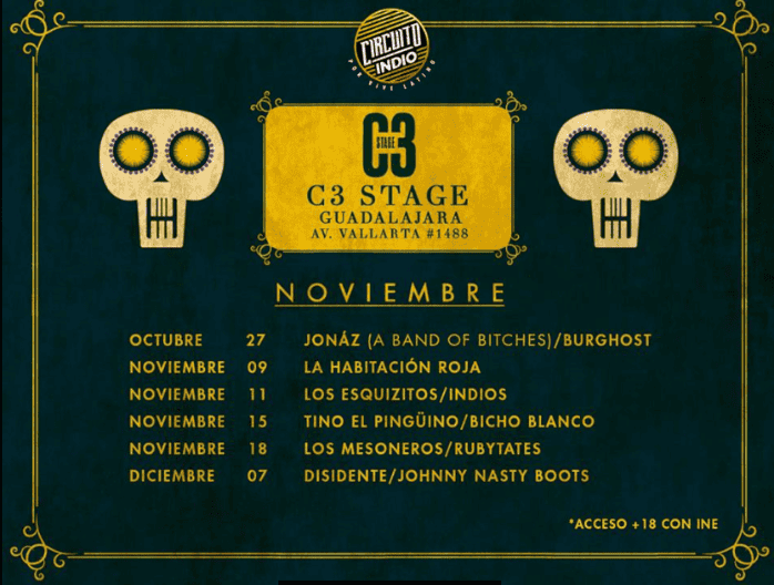 Todo listo para que este fin de semana incie el séptimo ciclo del Circuito Indio, programado del 26 de octubre al 18 de noviembre, el cartel contará con la presencia de tres bandas internacionales: Argentina levanta la mano con el arribo de Indios; desde España, recibimos a La Habitación Roja; y Venezuela aportará la participación de Los Mesoneros. El line up se completa con las bandas mexicanas: Disidente, Jonáz, Quiero Club, Los Esquizitos, Rubytates, Tino el Pingüino y Bicho Blanco.Este Ciclo también será de estrenos, pues buena parte del talento que girará se encuentra promocionando material de reciente manufactura.Jonáz, de Plastilina Mosh y A band of bitches, rodará por las carreteras llevando bajo el brazo su placa solista Mi Primer Disco. Tino el Pingüino, cuyo single “Fractúbela” cuenta ya con más de un millón de reproducciones en Spotify. Indios llegará al Circuito Indio con material fresco: su disco Asfalto, publicado en mayo pasado. Finalmente, podremos escuchar en vivo las canciones de Malas Lenguas, el primer álbum de Bicho Blanco, el nuevo proyecto de Ferni y Bernie de The Guadaloops.Te dejamos las fechas de las presentaciones27 de octubre: Jonáz (Plastilina Mosh y A band of bitches) + Burghost9 de noviembre: La Habitación Roja11 de noviembre: Los Esquizitos + Indios15 de noviembre: Tino El Pinguino + Bicho Blanco18 de noviembre: Los Mesoneros + Rubytates7 de diciembre: Disidente + Jonnny Nasty Boots
