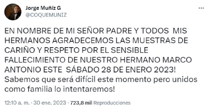La madrugada de este lunes, el cantante Jorge "Coque" Muñiz y su familia, anunciaron la muerte de su hermano Marco Antonio Muñiz quien falleció desde el pasado sábado por causas desconocidas. Fue el mismo Jorge Muñiz quien dio a conocer la noticia a través de sus redes sociales, anunciando su partida de este mundo y agradeciendo a todas las muestras de cariño de los amigos cercanos y fans; mencionó que a pesar del dolor él y su familia está unida más que nunca. "En nombre de mi señor padre y todos mis hermanos, agradecemos las muestras de cariño y respeto por el sensible fallecimiento de nuestro hermano Marco Antonio este sábado 28 de enero 2023. Sabemos que será difícil este momento, pero unidos como familia lo intentaremos", escribió en una publicación de su cuenta de Twitter. A pesar de no dar más detalles, el cantante mostró su agradecimiento con los médicos del Instituto Nacional de Enfermedades Respiratorias (INER), quienes siempre trataron de la mejor manera a su hermano y lo atendieron muy bien. "También quisiéramos agradecer a los doctores del INER, por todo su apoyo y atención para nuestro querido hermano. Siempre le dieron un excelente trato y atención", agregó.Hasta ahora, estás son las únicas declaraciones que la familia ha hecho; sin embargo, varios amigos y personalidades del mundo del espectáculo se han unido para expresar sus condolencias al querido cantante.MF