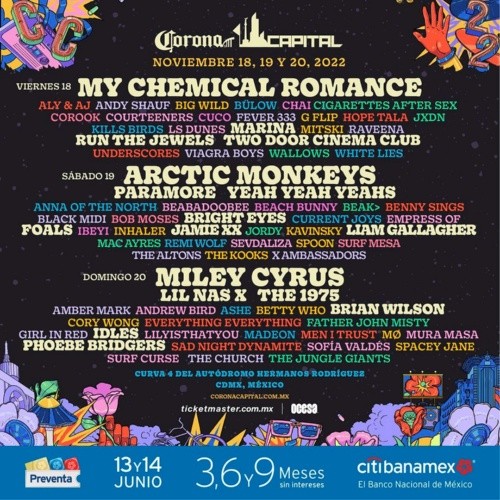 Luego de especulaciones en redes sociales, por fin el Corona Capital develó el elenco de su edición 2022 que se llevará a cabo los días viernes 18, sábado 19 y domingo 20 de noviembre en la Curva 4 del Autódromo Hermanos Rodríguez en la Ciudad de México. La preventa de los boletos será el 13 y 14 de junio para quienes tengan tarjeta Citibanamex.Los protagonistas del día viernes serán My Chemical Romance, Marina, Run The Jewels y Two Door Cinema Club, entre otros artistas más. Mientras que el sábado los grandes protagonistas serán Arctic Monkeys, Paramore y Yeah Yeah Years, entre otros más. Como cereza del pastel, el domingo la estrella pop Miley Cyrus será la estelar y tras de ella figuran otros nombres importantes como Lil Nas X y The 1975. Desde que se publicó el cartel en la cuenta de Twitter del Corona Capital, la interacción con el cartel ha estado a la alza.MF