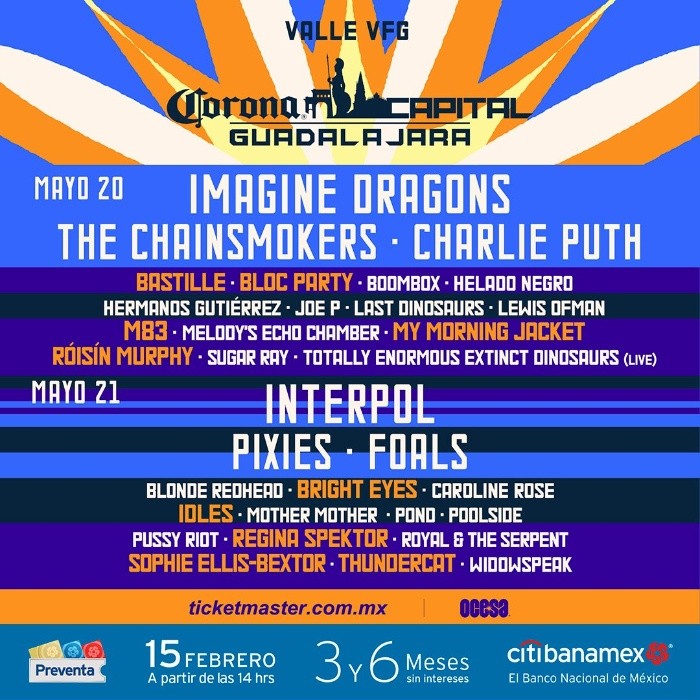 Luego de semanas de especulaciones sobre las bandas que estarían presentes en la edición de 2023, el festival Corona Capital Guadalajara dio a conocer la alineación que tocará en la ciudad.Con Imagine Dragons, The Chainsmokers y Charlie Puth, además de Interpol, Pixies y Foals, el festival Corona Capital GDL 2023 se llevará a cabo los días 20 y 21 de mayo en el Valle VFG.La preventa de boletos comenzará el 15 de febrero a partir de las 14:00 horas, con tres y seis meses sin intereses para clientes de un banco nacional.Imagine Dragons The Chainsmokers Charlie Puth Castille Bloc Party Boombox Helado Negro Hermanos Gutiérrez Joe P Last Dinosaurs Lewis Ofman M83 Melody's Echo Chamber My Morning Jacket Róisín Murphy Sugar Ray Totally Enormous Extinct Dinosaurs (Live)Interpol Pixies Foals Blonde Redhead Bright Eyes Caroline Rose Idles Mother Mother Pond Poolside Pussy Riot Regina Spektor Royal & the Serpent Sophie Ellis Bextor Thundercat WidowspeakOF