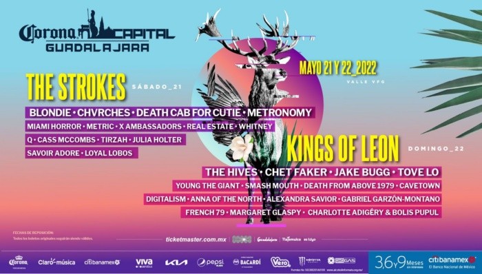 Ocesa reveló este jueves a las bandas que protagonizarán el Corona Capital Guadalajara que se realizará los días 21 y 22 de mayo de 2022.De acuerdo con los realizadores, el próximo año regresa el Corona Capital Guadalajara “más grande y fuerte” luego de la pandemia por COVID-19, que obligó a cancelar su edición 2020 y 2021.“Hemos trabajado intensamente en cuadrar las agendas de las bandas y con gran orgullo te compartimos que logramos confirmar a los headliners que se habían presentado en el 2020”, destacó Ocesa a través de un comunicado obtenido por este medio.Ocesa recordó que los boletos adquiridos en la edición 2020 podrán ser usados para esta nueva entrega. Asimismo, los fanáticos que deseen asistir a los conciertos, podrán comprarlos en venta general el próximo 25 de octubre a partir de las 11:00 horas en el sistema Ticketmaster.Abono General:Boleto General por día:Abono Comfort Pass:Comfort Pass por día:Abono Plus:Boleto Plus por día:AC