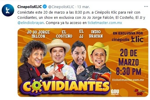 El próximo sábado 20 de marzo a las 20:30 horas a través de Cinépolis Klic, se presentará el episodio uno de “Covidiantes”, producción realizada por Alejandro Gou. En esta primera entrega participan los humoristas Jo Jo Jorge Falcón, “El Costeño”, El JJ y el Indio Brayan.Cada uno tendrá su propia rutina donde hablarán, entre otras cosas, sobre cómo han vivido la pandemia.La venta de boletos es en Ticketmaster y cuestan los accesos 200 pesos.Comparte “El Costeño” su emoción de compartir escenario con estos compañeros humoristas, a quienes les reconoce su labor y su trayectoria.El comediante expresa que la visión que cada uno tiene sobre este año tan complicado, puede ser similar en ciertos puntos, pero cada uno ha vivido la pandemia muy distinta y de ahí es donde generarán la comedia para que el público se divierta.“De lo que nosotros hablamos es muy variado y lo estamos haciendo dentro del contexto de la pandemia, de lo que estamos viviendo y nos atañe a todos. Cada uno aborda desde su óptica y desde su manera vivir esto que estamos pasando y desde ahí hacemos humor”, expresa.Al finalizar cada uno su participación, todos harán un breve sketch.