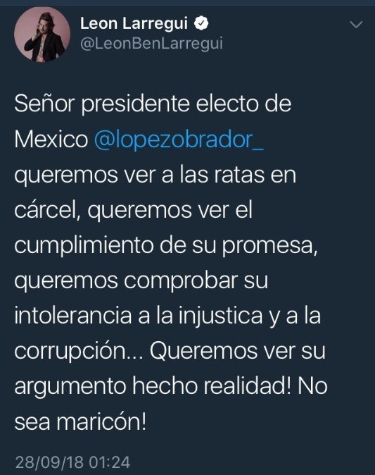 León Larregui compartió en su cuenta de Twitter varios mensajes soeces dirigidos al presidente electo, Andrés Manuel López Obrador.En uno de dichos mensajes, Larregui le pide a López Obrador que "no sea maricón", y que cumpla con las promesas que hizo en campaña, pues los mexicanos quieren "comprobar su intolerancia a la injusticia y la corrupción".También escribió que muchos "queremos ver a las ratas en cárcel, queremos ver el cumplimiento de su promesa".En otro mensaje, el cantante publicó que debe enjuiciarse al actual Presidente, Enrique Peña Nieto y "llevarlo al paredón".Varios usuarios lamentaron el uso de palabras del cantante, por su naturaleza homofóbica."Prefiero mil veces hipster sensible a una sociedad que incita el odio y la marginación y termina en crímenes homofóbicos y feminicidios", opinó una usuaria.Otros consideraron exagerada la crítica y absurdo el comentario de Larregui."Te equivocas León al que le debiste reclamar y tuviste 6 largos años fue a @EPN, espera a que el presidente electo @lopezobrador entre en funciones en 2 meses. ¡No seas menso!".OF
