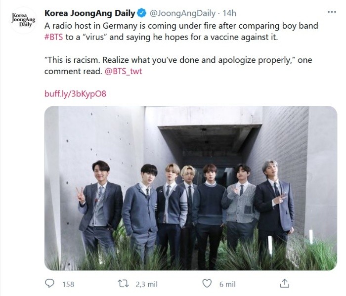 Ya es costumbre ver a la banda surcoreana BTS entre las principales tendencias en internet en todo el mundo. Sus fans son muy dedicados para mantener en boca de todos al grupo que ha traspasado barreras con gran éxito. Sin embargo, esta ocasión el motivo de la tendencia es el racismo.El locutor de radio Matthias Matuschik, quien trabaja para la estación de radio Bayern 3, de Baviera (Alemania) hizo comentarios racistas hacia los integrantes del grupo. La conversación surgió como crítica al cover de "Fix You", originalmente de Coldplay, que BTS presentó en su MTV Unplugged.Matuschik describió a la banda como un "virus horrible" y aseguró que espera que pronto se encuentre una vacuna para combatirlos, haciendo referencia a la actual pandemia de COVID-19 que tuvo origen en Wuhan, China.El conductor agregó que era una "blasfemia" lo que había hecho BTS con el cover de "Fix You". Tras decir sus polémicos comentarios, Matuschik justificó que no era una persona xenofóbica y pidió que no se le acusara de esto porque maneja un auto hecho en Corea del Sur y que es el "más genial de todos".Pese a la indignación mundial, de acuerdo con el medio alemán Deutsche Welle, la estación de radio Bayern 3 defendió a Matuschik. Un representante del medio dijo que aunque el locutor sí se excedió en sus comentarios, aseguró que no era su intención lastimar los sentimientos de nadie y argumentaron que ese es el tono del programa."En este caso, él rebasó la línea con su elección de palabras al tratar de exponer su opinión en un tono exageradamente irónico", comunicó la estación de radio.Los admiradores de BTS han compartido publicaciones en Twitter bajo hashtags como #Elracismonoesunaopción, #racismisnotanoption y #Bayern3apologize; así como mensajes que los integrantes del grupo musical han hecho a lo largo de su carrera con respecto al racismo.JM