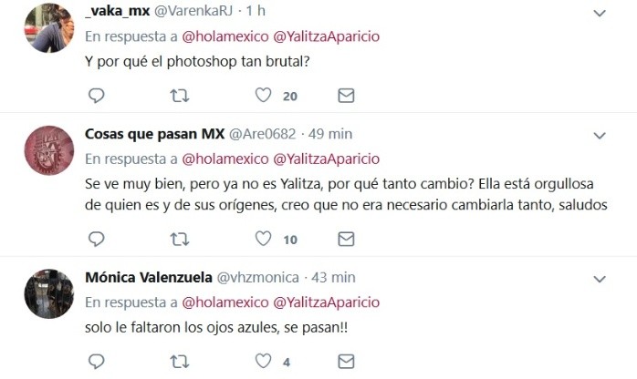 Hace tan solo un par de horas que la revista ¡Hola! México lanzó su portada donde Yalitza Aparicio es protagonista, pero provocó críticas por el exceso de Photoshop.A pesar de algunas buenas críticas, usuarios de Internet desaprueban que se haya usado demasiado Photoshop y argumentan que Yalitza luce "más delgada, más alta y más blanca de lo que es".Comentarios como "Un filtro más y se ganan el Oscar a la fotografía más truqueada". O "La blanquearon mucho y el cuerpo luce muy estilizado, no que muy orgullosos de cómo es pues ¿deberían de ver la sesión de fotos que hizo VOGUE", son algunos de los comentarios que están tanto en Facebook como Instagram.Algunos usuarios simplemente comprendieron que es parte de la línea de la revista, sin embargo critican el uso excesivo de Photoshop y el supuesto blanqueamiento de piel.Sin embargo, hubo quienes argumentan que se trata de un mensaje clasista y racista y que esto ya no puede ocurrir.A pesar de esto, hubo quienes defendieron a Yalitza pero desaprobaron a la revista, tal es el caso de Mirthala Botello García que declaró lo siguiente: "Ella es hermosa naturalmente, y ese vestido se le ve espectacular, pero opino que exageraron en los retoques, no era necesario".JB