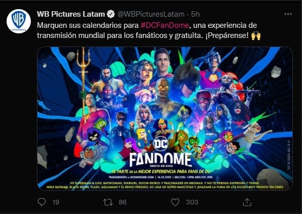 Si eres fanático de los súper héroes y universos de DC, el próximo 16 de octubre podrás sumarte al encuentro global que la franquicia celebrará vía streaming con acceso gratuito, en donde se revelarán las novedades y proyectos que se alistan para DC Multiverse.A través de la plataforma DCFanDome.com, el público podrá interactuar con los protagonistas y creadores de las películas, series animadas, videojuegos y cómics del universo de DC, además de que los niños también podrán formar parte de las diversas actividades desde “DC Kids FanDome”.DC informó que la edición 2021 del DC FanDome estará disponible en Twitch, YouTube, Facebook y Twitter, para dar a los fans más opciones de ver todo lo que sucederá en el Salón de los superhéroes del DC FanDome.“La edición 2020 de DC FanDome fue la primera experiencia para fans global virtual en su tipo y mostró cada aspecto del Universo DC con acceso y a una escala sin precedentes. Este año tomamos todo lo que los fans amaron del DC FanDome y lo elevamos al máximo para dar un superservicio a los fans con más adelantos exclusivos, noticias, entrevistas a profundidad y comentarios de las estrellas y equipos creativos de sus contenidos favoritos de DC”, explicó Ann Sarnoff, presidenta y directora ejecutiva de WarnerMedia Studios y Networks Group.DC FanDome 2020 fue la primera experiencia para fans global virtual en su tipo y reunió a la mayor cantidad de talento, anuncios y debut de contenidos en la historia de DC. Las secciones de Salón de los superhéroes y Explora el multiverso del DC FanDome recibieron más de 22 millones de visitas en todo el mundo, alrededor de 220 países y territorios, con más de 150 millones de vistas a tráilers y contenidos.DC FanDome reunirá a una cantidad sin precedentes de actores y creadores responsables de los videojuegos, cómics, películas y programas de televisión, y así dar a conocer las más recientes novedades de esta franquicia con lanzamientos exclusivos de tráileres, por ejemplo.Toda la programación del DC FanDome estará subtitulada en varios idiomas, incluidos: alemán, árabe, coreano, chino, español, francés, inglés, italiano, japonés, polaco, portugués brasileño y ruso. Esta segunda edición del DC FanDome nuevamente será una experiencia gratuita para los fans de todo el mundo. Para los fans de China, además de tener acceso a disfrutar de todos los contenidos globales, también podrán ver una variedad de exclusivas de DC locales.El acceso a DC FanDome estará disponible desde cualquier dispositivo: teléfono, tableta, laptop o computadora de escritorio. Para tener las novedades más recientes es necesario registrarse (gratuitamente) en DCFanDome.com, en donde se compartirán todas las noticias directamente en su buzón de correo electrónico y obtendrán acceso a exclusivas para socios.A partir del 24 de septiembre y hasta el final de octubre, la división de productos de consumo de Warner Bros. lanzará la tienda DC FanDome para que todos los fans puedan adquirir ropa, accesorios, artículos coleccionables y más. Tendrán mercancía de DC Comics exclusiva y disponible solamente a través de la tienda del DC FanDome, con nuevas inclusiones cada semana hasta el día del evento, el 16 de octubre.***Si te interesó esta noticia y quieres saber más, entonces descarga y descubre INFORMAPlus, la aplicación digital de EL INFORMADOR, en donde tenemos contenidos exclusivos, seleccionados por nuestros editores, para darles una experiencia más completa a los lectores.Descarga la aplicación y pruébala GRATIS por treinta días.Para iOS: https://apple.co/35jaVgbPara Android: https://bit.ly/3gwVSEVSi eres suscriptor de EL INFORMADOR tu acceso está incluido, solicítalo al 33 3678-7777AC